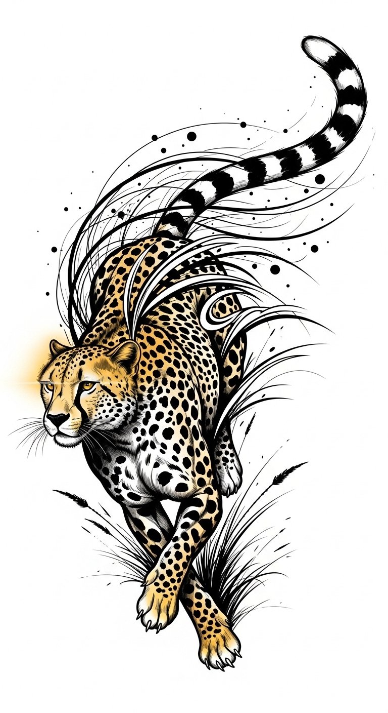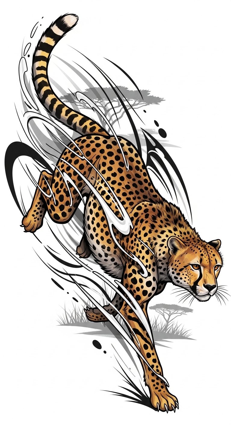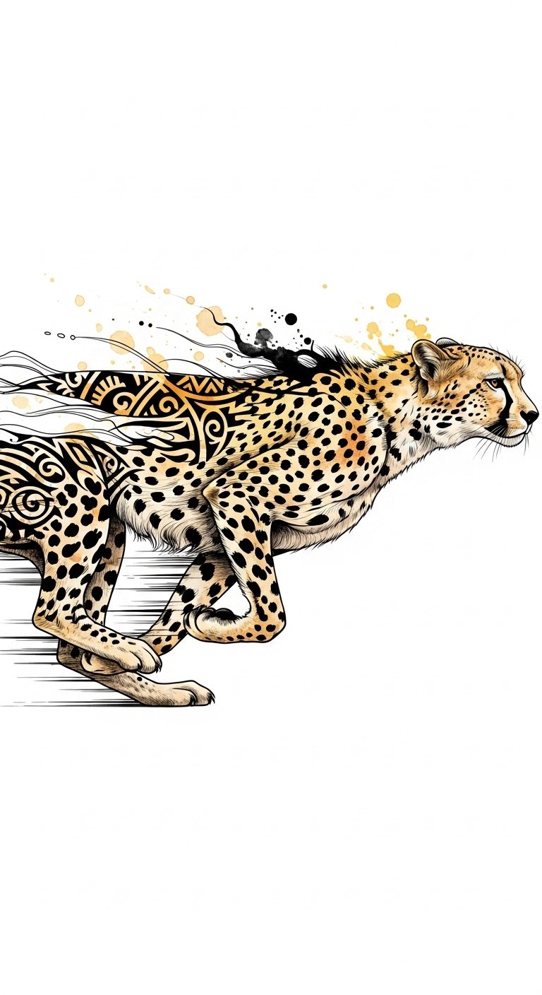 This design symbolizes the union of raw speed and ancestral heritage—freedom, strength, and a spiritual kinship with the wild—intended to evoke confidence and inner drive; placement along the forearm or side torso accentuates the cheetah’s motion so the image lengthens with the body’s natural lines, creating an emotional connection through movement and cultural motifs that read clearly from a distance yet reveal intricate pattern work up close.