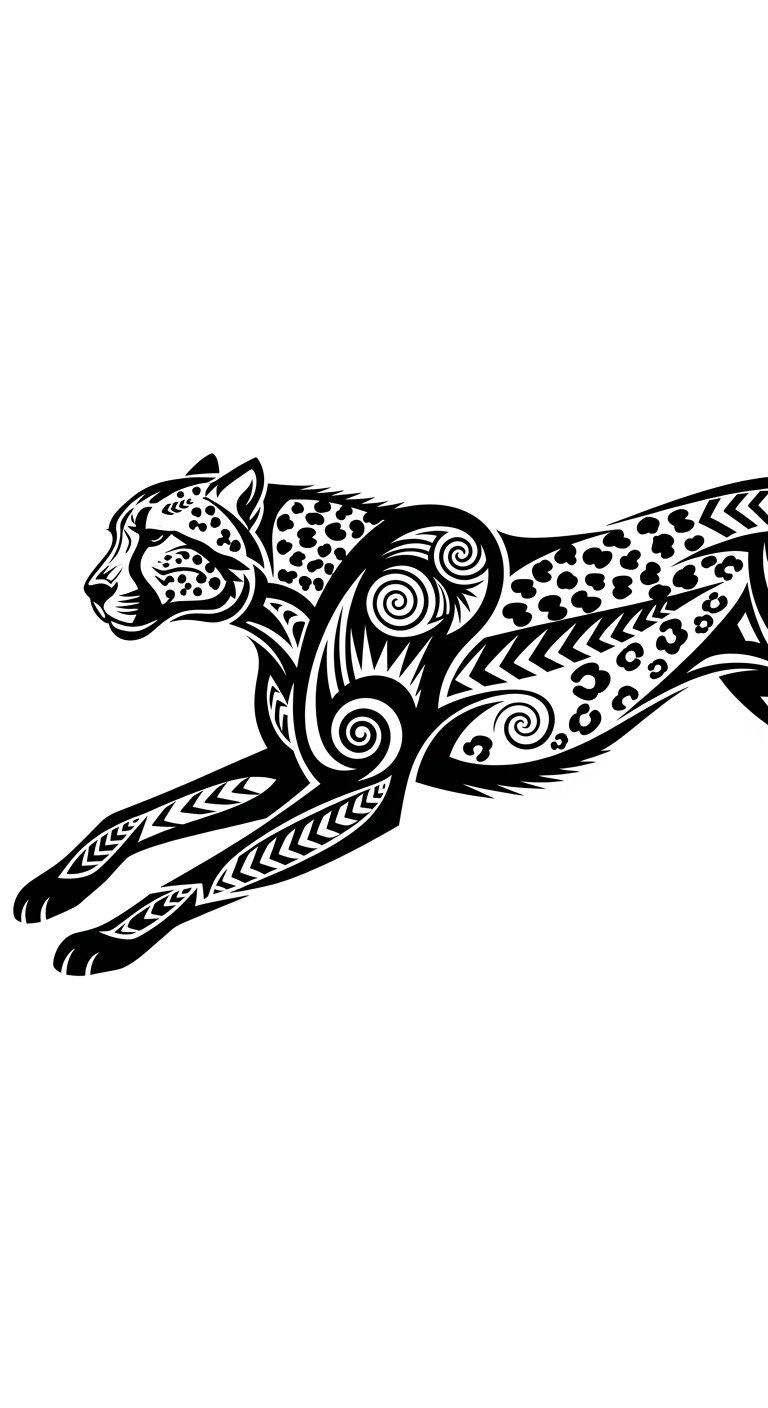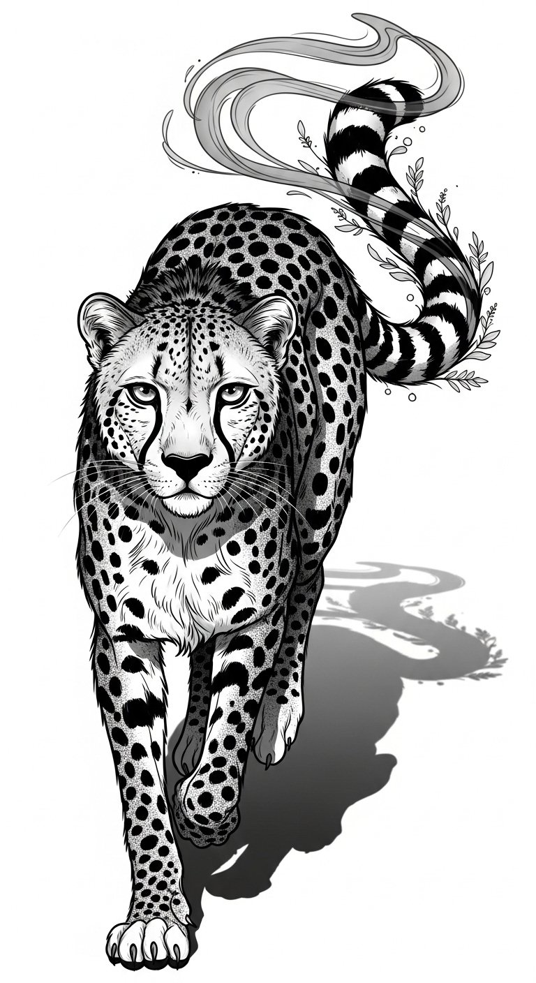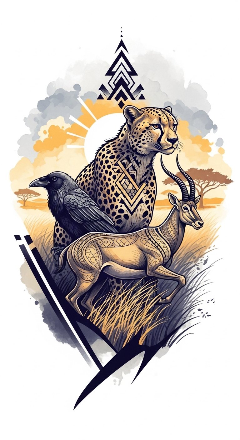 This design symbolizes the union of raw speed and ancestral heritage—freedom, strength, and a spiritual kinship with the wild—intended to evoke confidence and inner drive; placement along the forearm or side torso accentuates the cheetah’s motion so the image lengthens with the body’s natural lines, creating an emotional connection through movement and cultural motifs that read clearly from a distance yet reveal intricate pattern work up close.