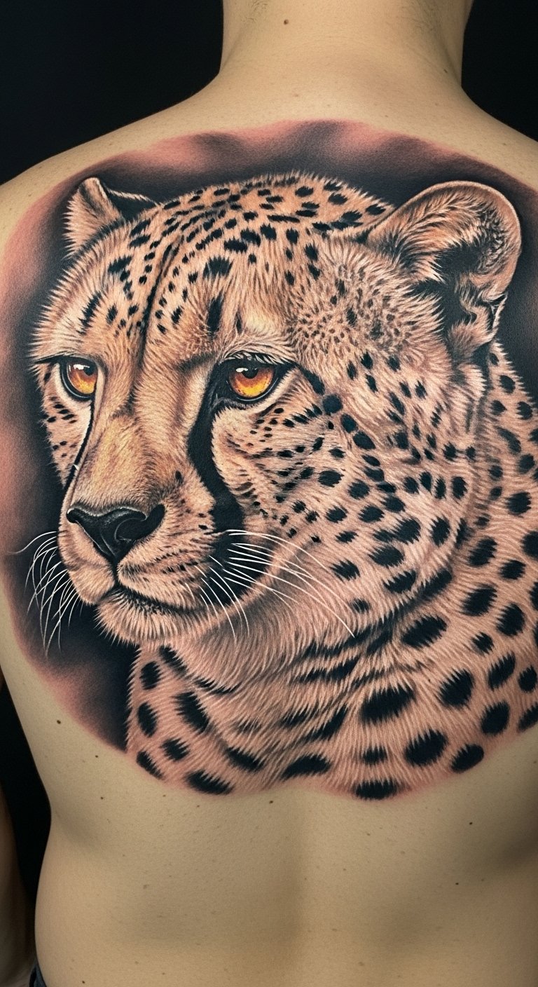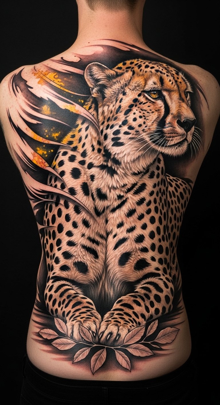 A large back placement lets the cheetah’s form and the flowing spot-to-ink transitions convey freedom, speed, and the quiet intensity of a predator at rest; the combination of photorealistic detail and abstract strokes evokes resilience and movement, while the warm golden highlights add vitality and warmth.