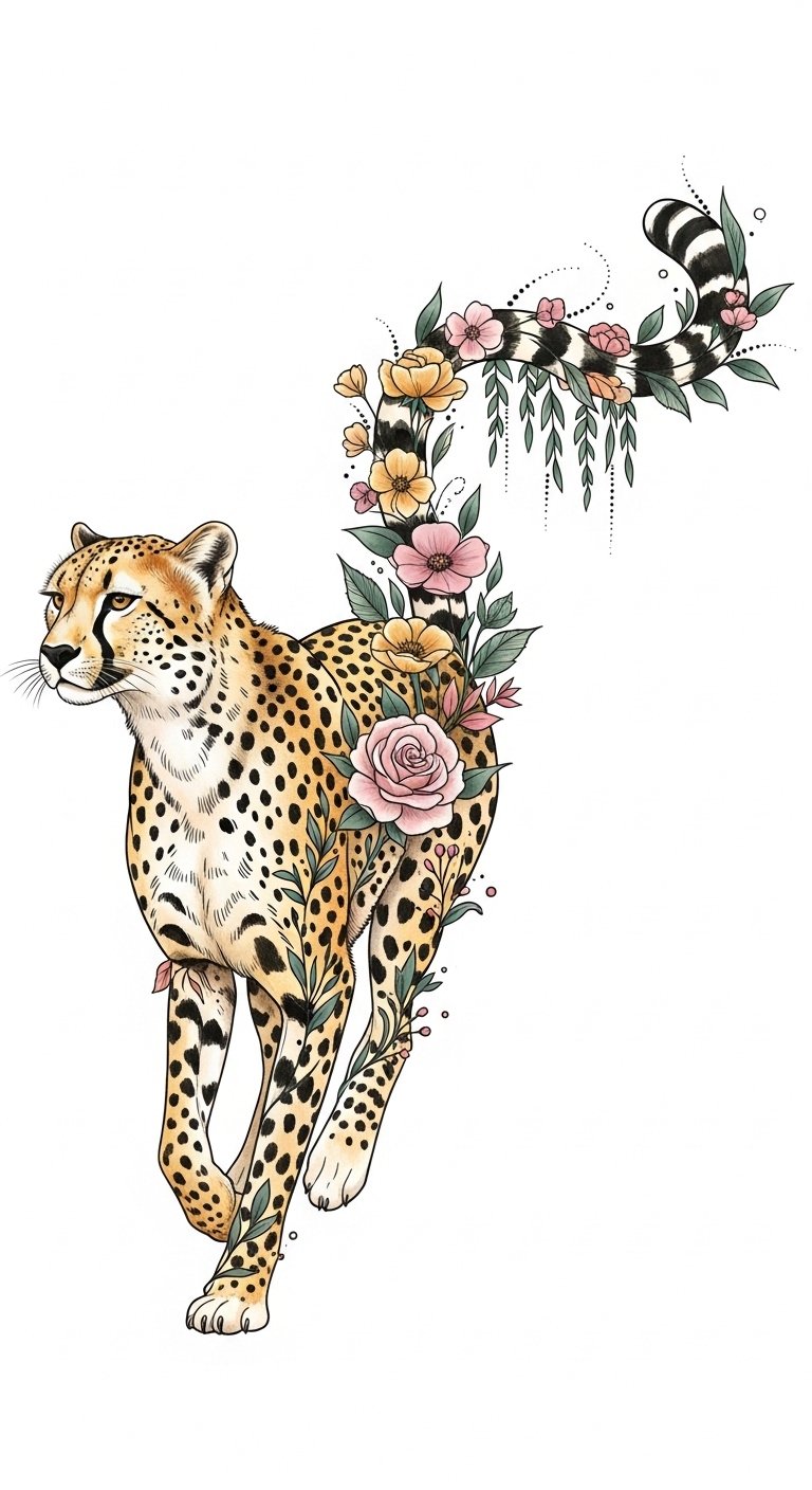 A graceful concept that merges fierceness and femininity: the cheetah’s motion suggests speed and determination while floral spots soften and personalize the image, evoking resilience blended with beauty.
