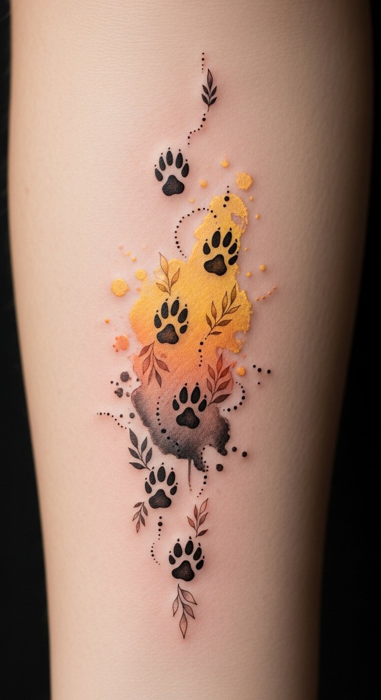 This tattoo concept uses the footprints as a visual narrative of progress and perseverance. The warm watercolor tones evoke courage and warmth, while dotwork and leaf negative space tie the design to nature and growth.