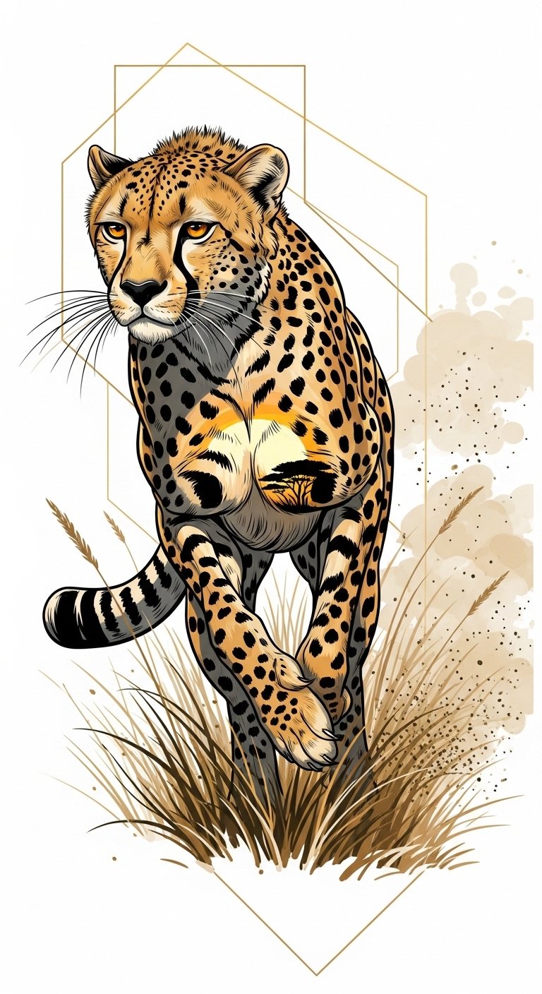 This design symbolizes focus, momentum, and resilience—the sprinting cheetah conveys urgency and the geometric accents represent structure within instinct.