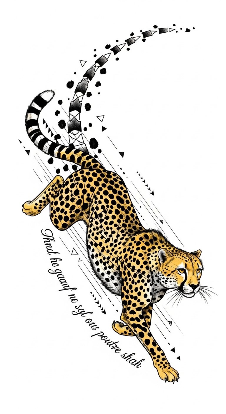 This tattoo concept channels the text’s vivid motion into a sweeping, mid-limb placement—forearm or calf—where the cheetah’s body arcs across the skin in sequential overlapping poses suggesting a burst of speed.