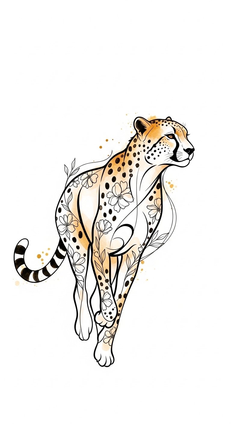 This artistic expression embodies cheetah symbolism and feminine energy, promoting wildlife preservation. The floral integration reflects nature’s balance, while vibrant color meanings create a personal connection, offering unique design inspiration rooted in cultural significance.