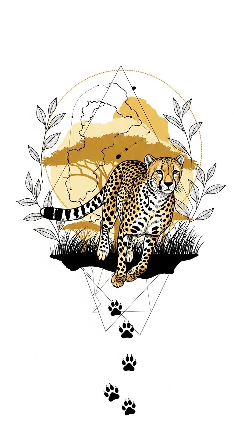 Your tattoo reflects a commitment to preserving cheetah habitats and ecosystems, supporting education and research to combat cheetah extinction, and fostering a brighter future for these incredible beings. The design ties these themes together: the running cheetah conveys speed and resilience, the savanna silhouette and habitat-map lines symbolize the ecosystems it depends on, and the paw-print negative space evokes a trail of advocacy.