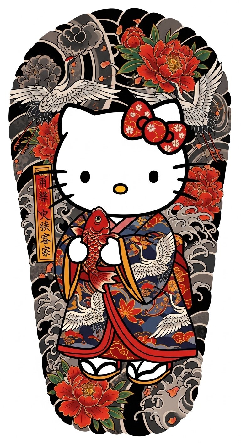 The cultural fusion of Hello Kitty’s playful spirit and the depth of Japanese artistry makes for a unique expression of freedom and individuality in body art. This design melds kawaii charm with classic irezumi motifs: the cranes signify longevity and good fortune, sakura and peonies bring fleeting beauty and prosperity, the koi represents perseverance, and the wind bars and waves add movement and balance.