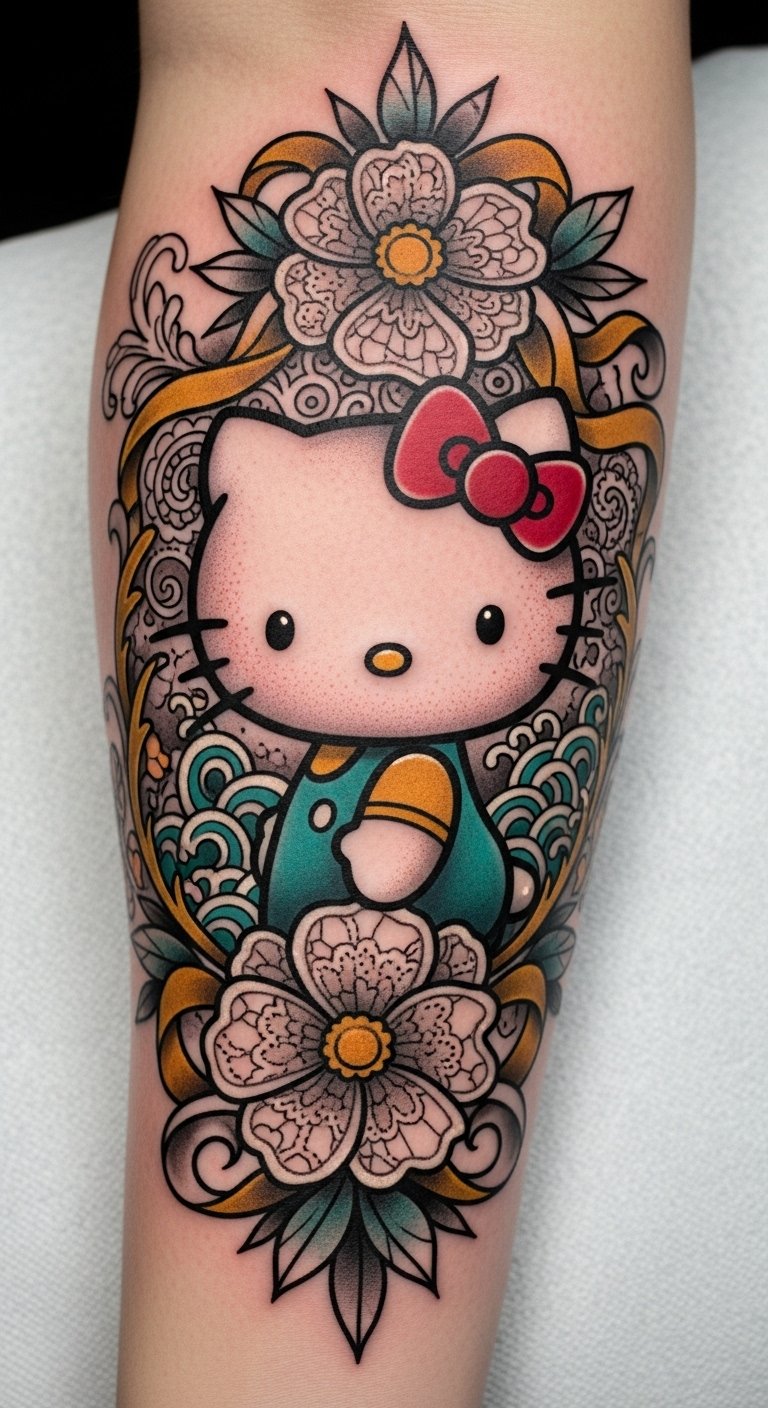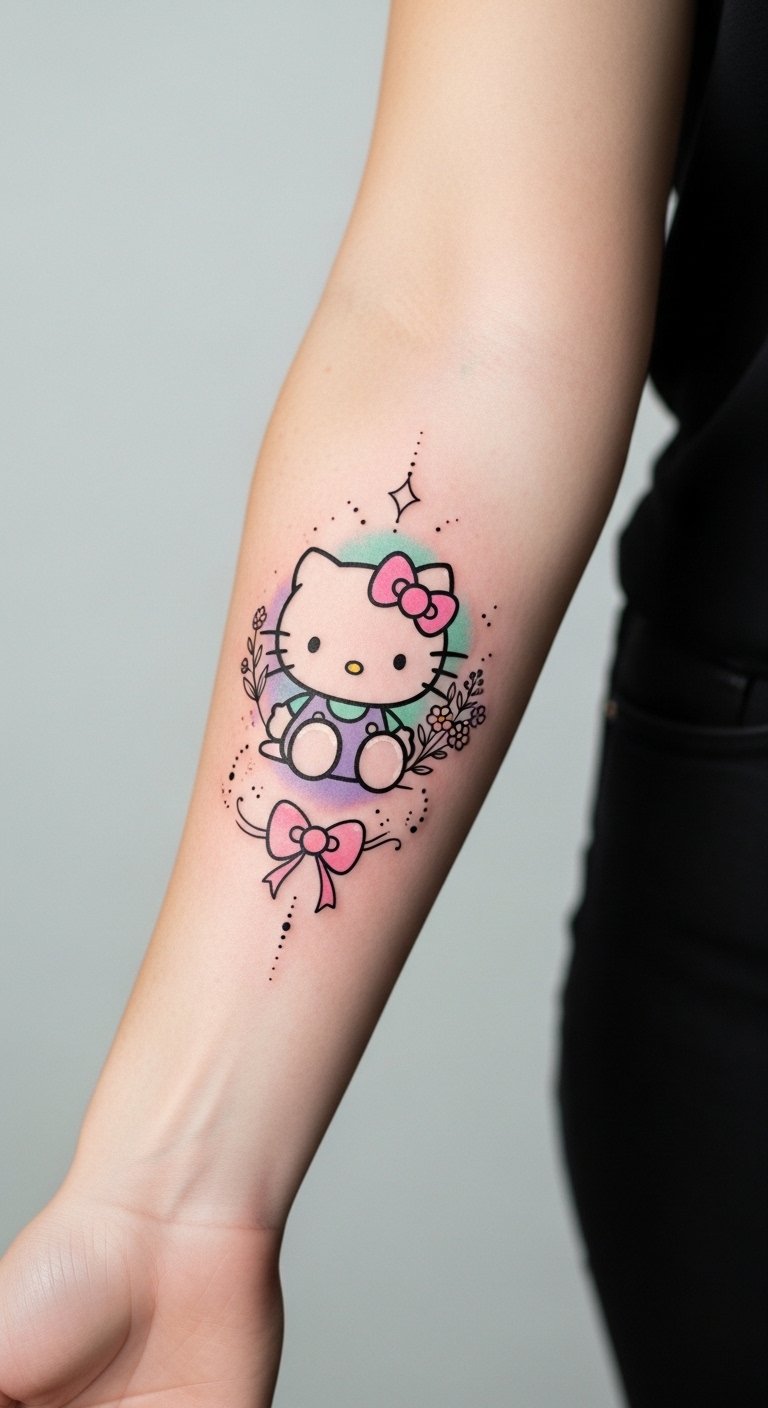 Whether you choose a tiny Kitty in a bow or a full scene, these tattoos celebrate your freedom to embrace joy and individuality wherever you go. The design symbolizes innocence, joy, and personal whimsy; soft colors evoke warmth and nostalgia while the wrap placement enhances movement and visibility—ideal for someone who wants a discreet yet expressive piece that feels intimate and uplifting.