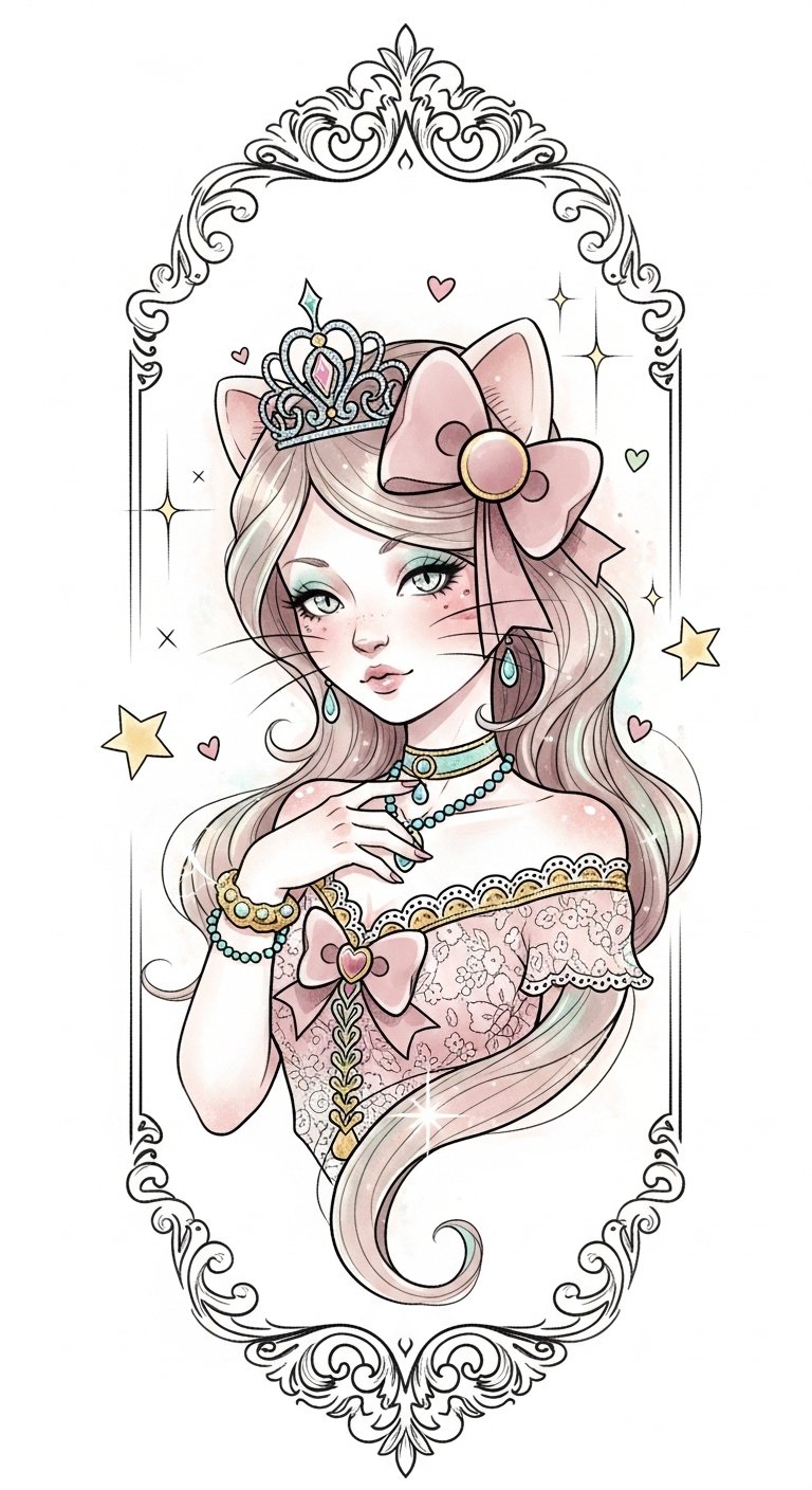 Embrace the charm, and let your skin tell a story of magic and grace. This design symbolizes youthful innocence blended with regal confidence — the bow and subtle cat-like features evoke playfulness and identity, the tiara and filigree suggest dignity and self-worth; emotionally it reads as joyful empowerment and nostalgic comfort.