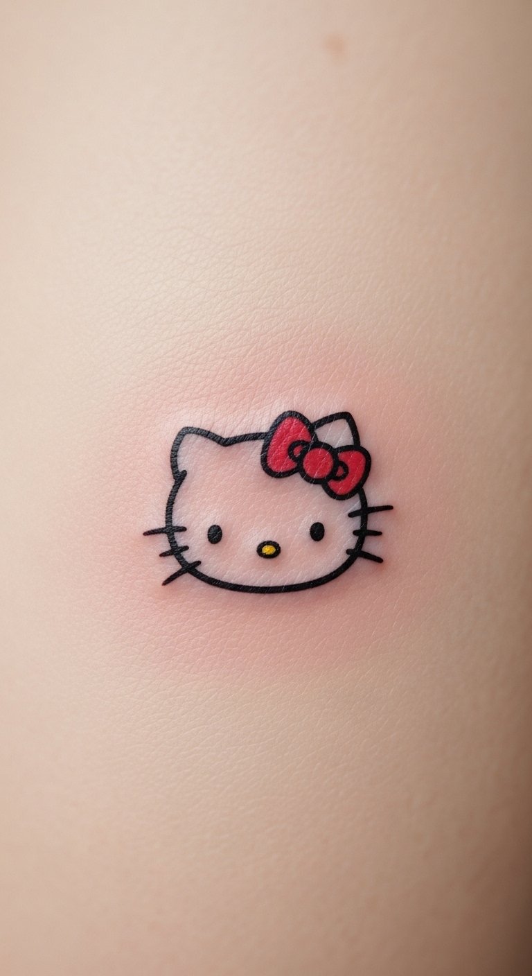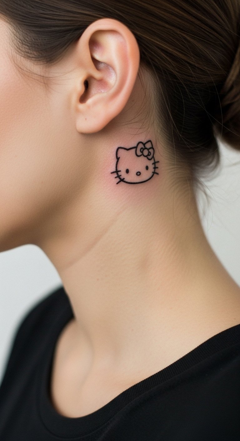 When placed behind the ear or along the nape, this tiny Hello Kitty motif becomes a private emblem of nostalgia and playful confidence; its small size preserves discretion while its familiar silhouette evokes warmth, innocence, and a quietly rebellious personal identity.