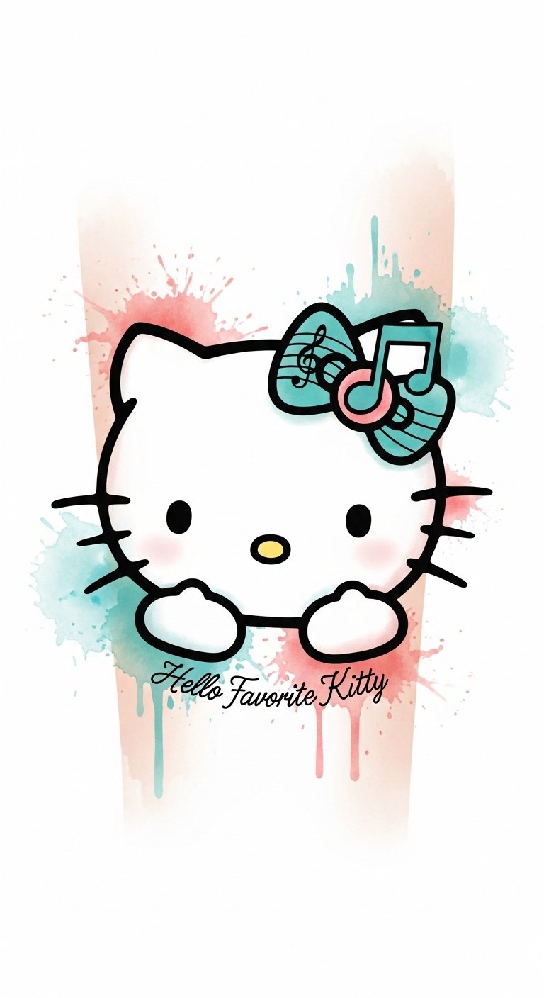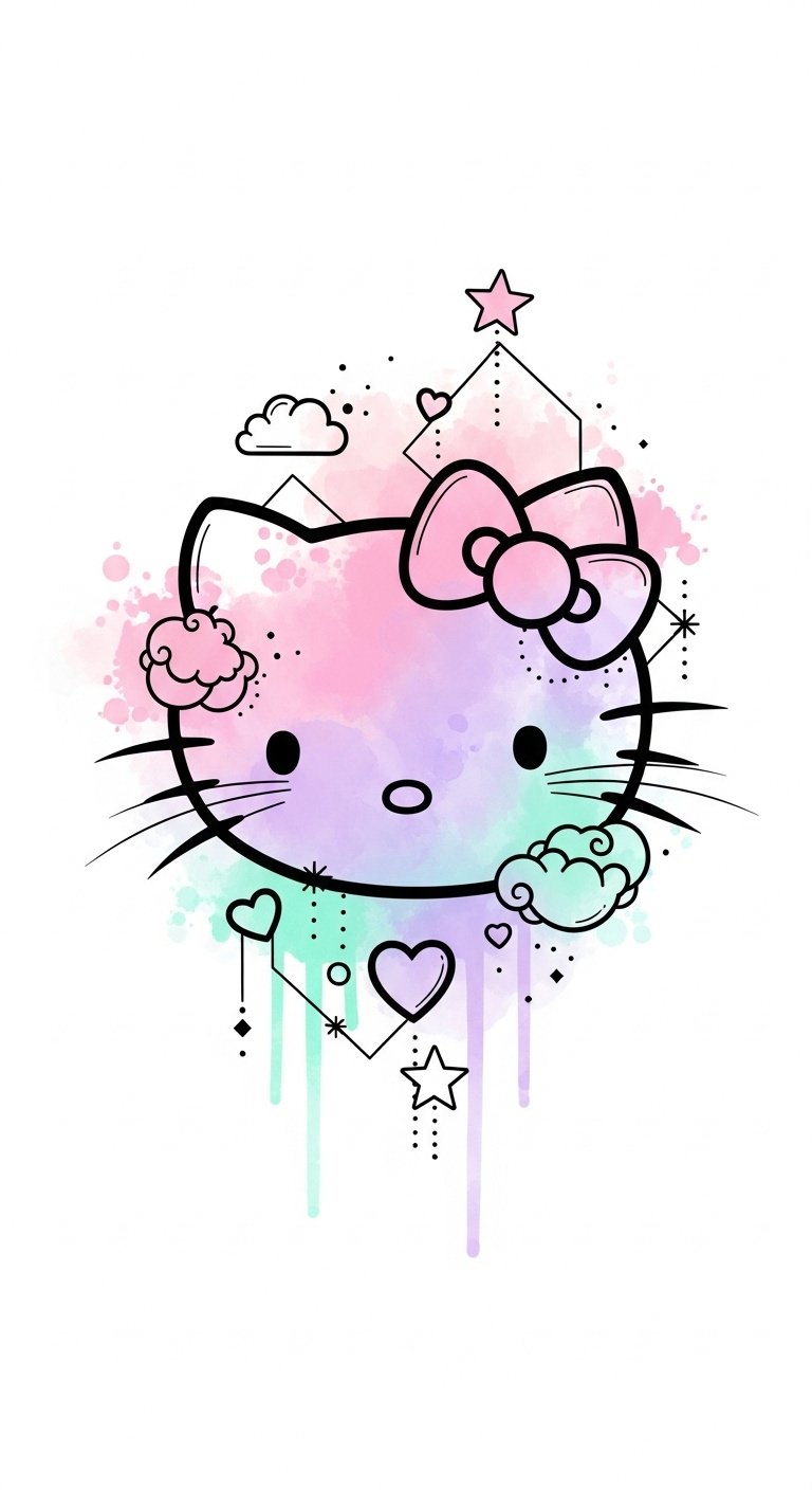 A delicate tattoo design centers Hello Kitty rendered in soft, pastel watercolor with subtle brush textures, framed by floating cherry blossoms and tiny stars; incorporate minimalist linework accents and a faint gold halo to hint at timeless appeal. Symbolically, the piece celebrates innocence, charm, and the evolution of personal identity through fandom—evoking warmth, nostalgia, and playful confidence. Emotionally intimate yet public-facing, it suits inner forearm, behind the shoulder, or ankle placements where the wearer can reveal or conceal the design, aligning with both personal expression and global cultural connection.