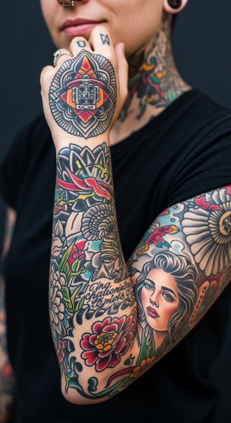 A forearm placement allows the design to read clearly in motion, the ornate floral frame and juxtaposed cultural motifs symbolizing the blend of heritage and personal evolution;