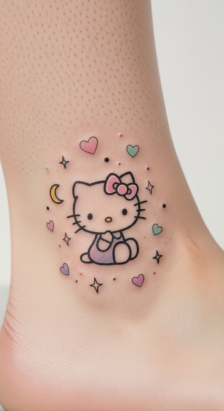 Ankle tattoos featuring Hello Kitty offer a charming and whimsical way to express your personality. With ankle placement, you can showcase cute designs that dance around your skin, adding a playful twist to your style.