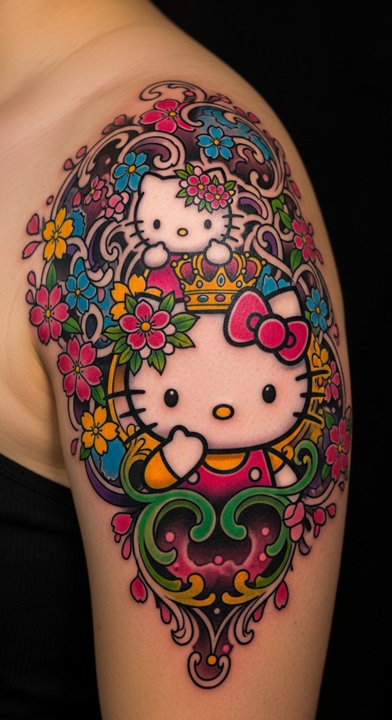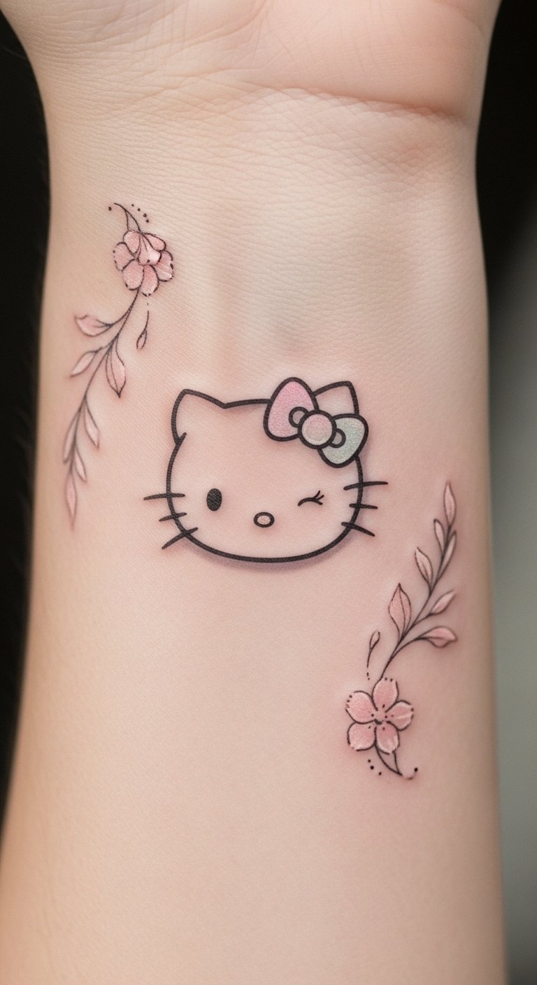 Personalizing your Hello Kitty tattoo can take on a whole new dimension by incorporating floral elements.