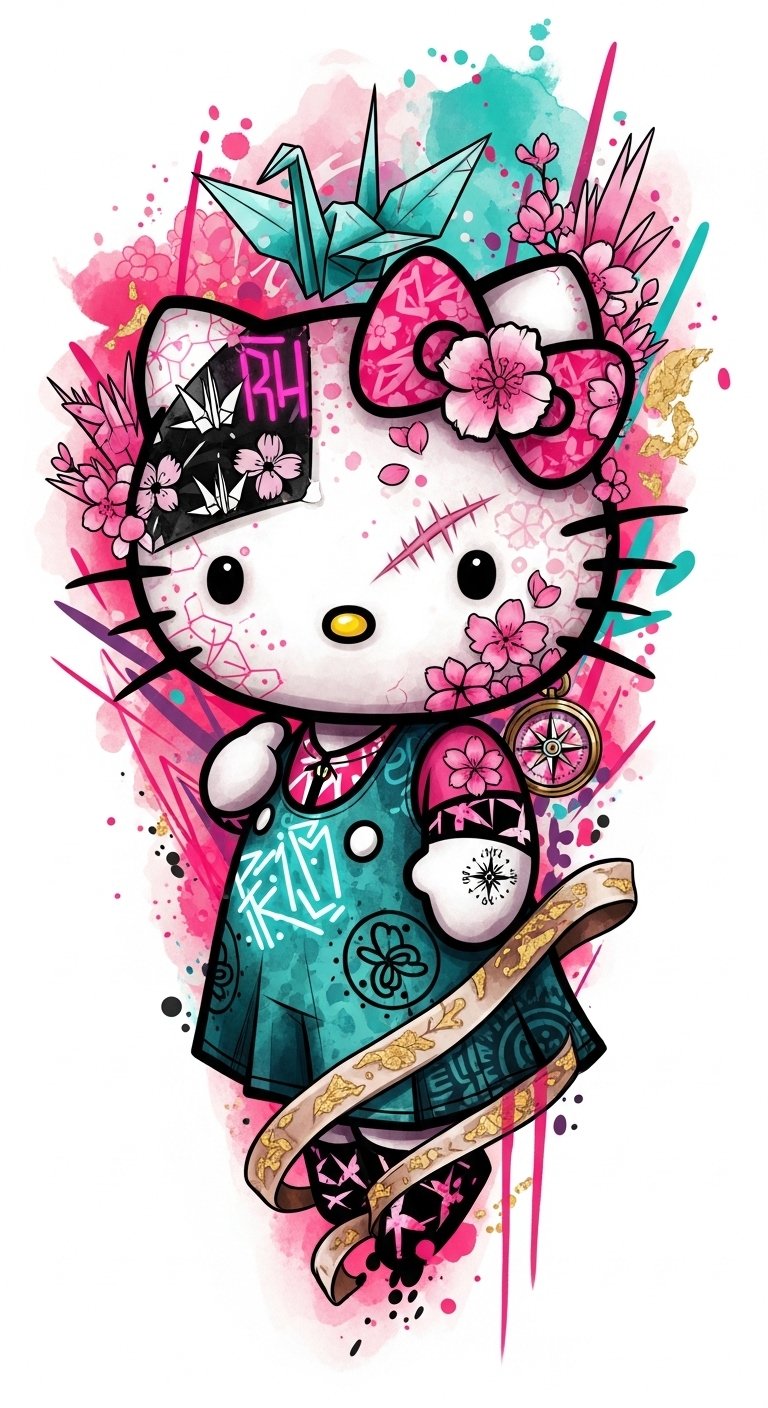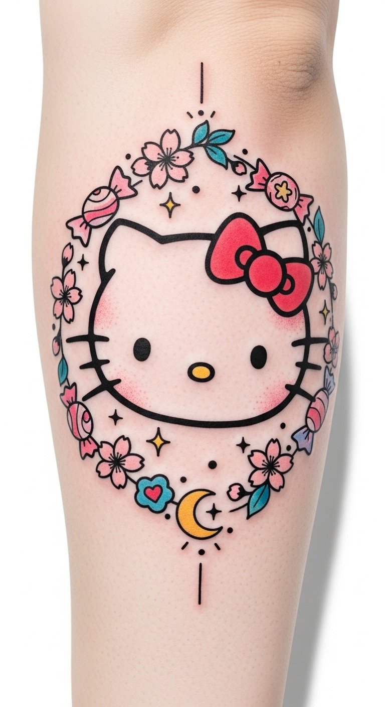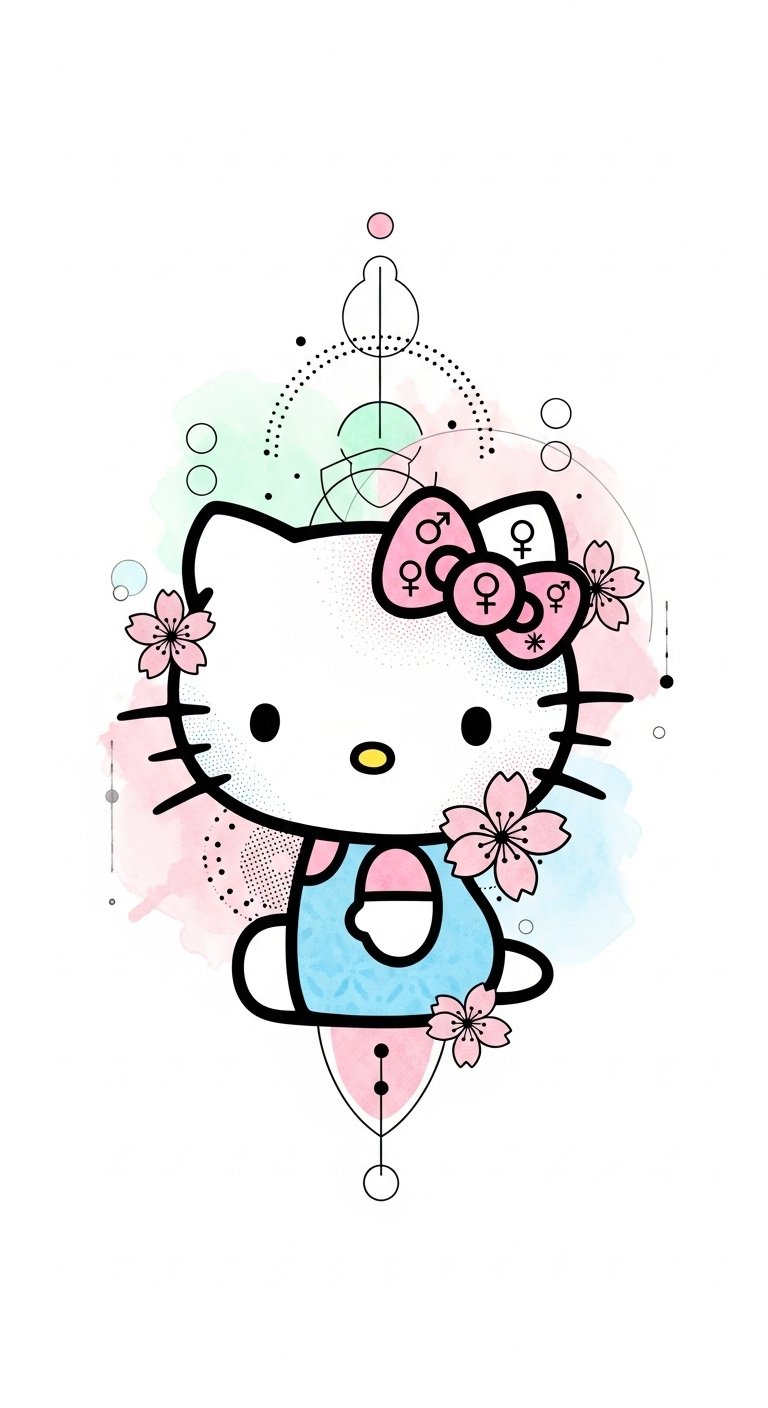 Social media influence and tattoo conventions amplify fan art, creating a thriving community that celebrates this iconic feline. This design symbolizes nostalgia and contemporary identity—soft colors and cherry blossoms convey innocence and renewal, geometric accents and gender-neutral details express inclusivity and modern self-expression; emotionally it balances whimsy with empowerment.