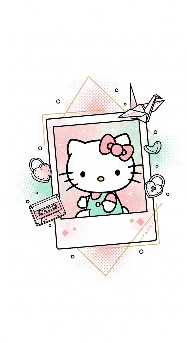 A design that blends whimsy and personal expression: Hello Kitty at the center evokes nostalgia and innocence, the sakura and stars suggesting fleeting beauty and dreams, vintage candy nodding to sweet memories, and the crescent moon hinting at quiet introspection.