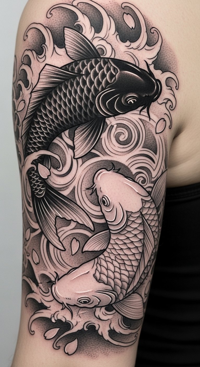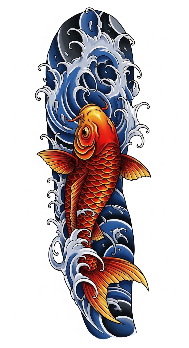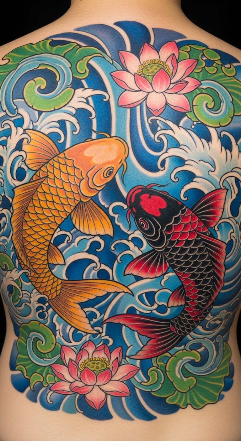 Koi fish entwined with waves create a dynamic tattoo that symbolizes the eternal dance between strength and fluidity.