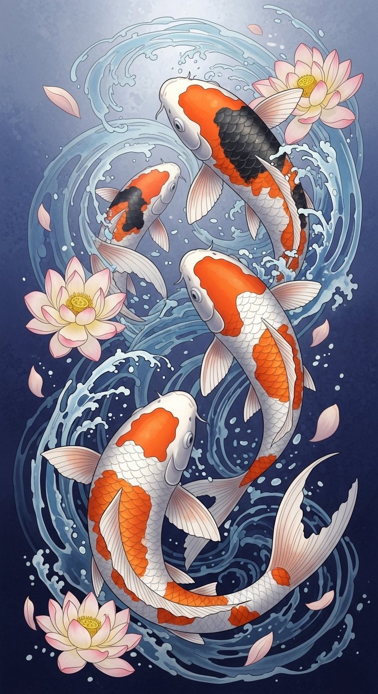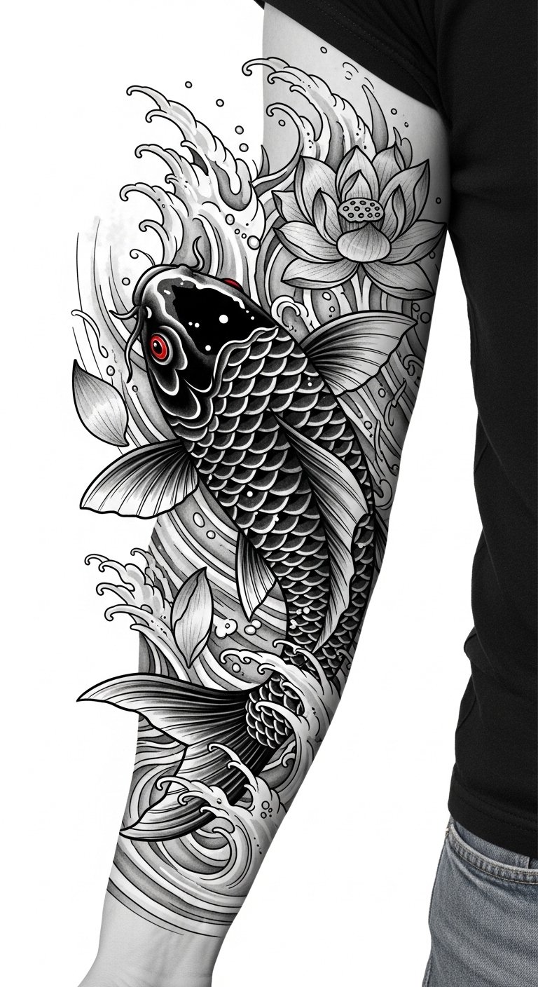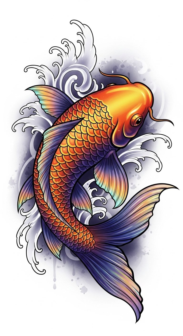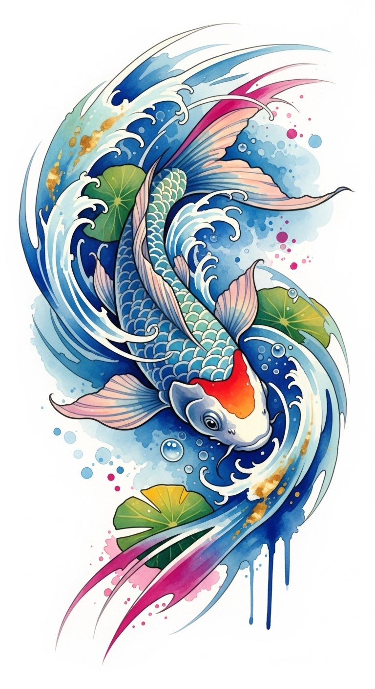 Linework can be bold for visibility or fine for a delicate, meditative feel, with color choices from traditional orange and black koi to subtle watercolor washes in blues and golds to enhance symbolism.