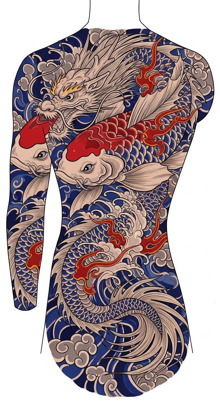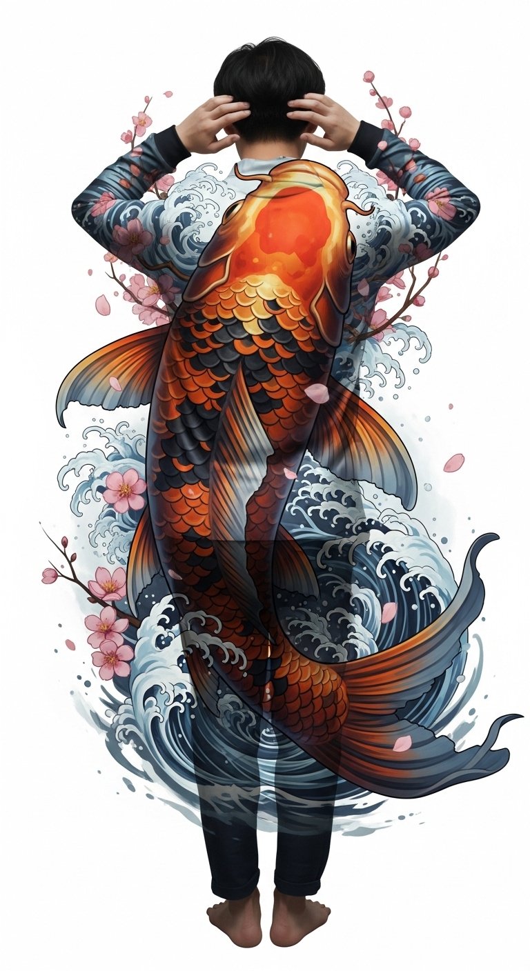 Embracing the large koi fish symbolism, this stunning design represents perseverance, strength, and freedom.