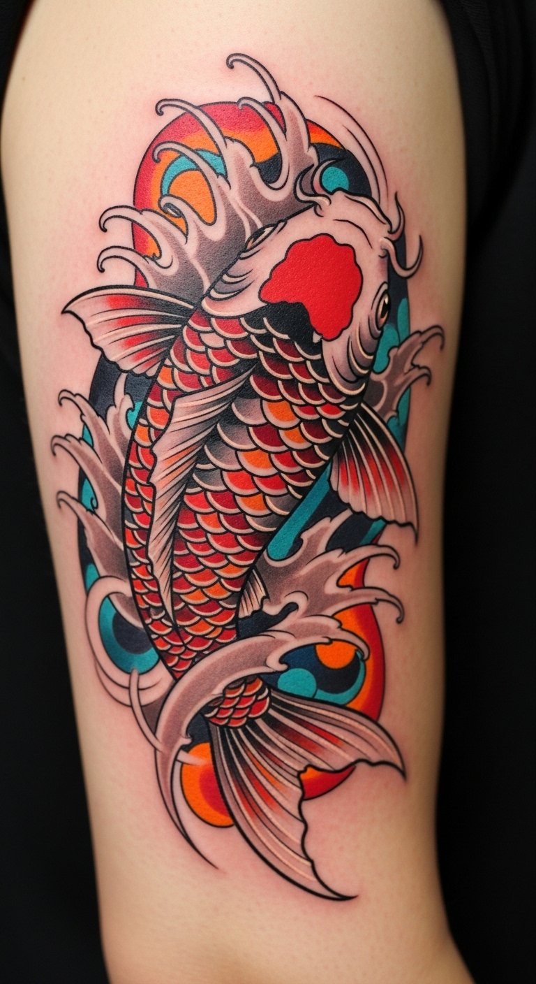 Abstract koi fish and floral motifs symbolize perseverance, renewal, and personal growth; this design evokes resilience and gentle transformation, suited for flowing placements like the shoulder, ribcage, or thigh where the composition can curve with the body and the vivid colors and linework communicate both strength and delicate beauty.