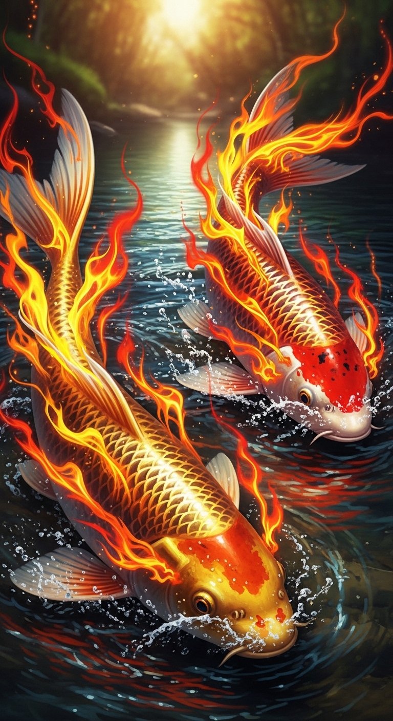 Symbolically, the koi represents perseverance and courage while the flames suggest purification and rebirth; together they evoke a fierce emotional narrative of overcoming obstacles and personal transformation.