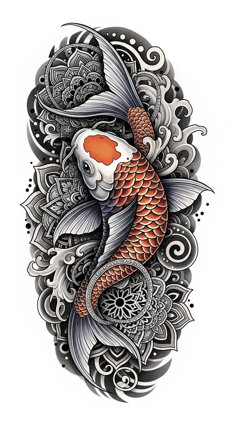 The koi and mandala together symbolize perseverance, transformation, inner balance, and spiritual growth; emotionally the design evokes calm resilience and hopeful renewal.