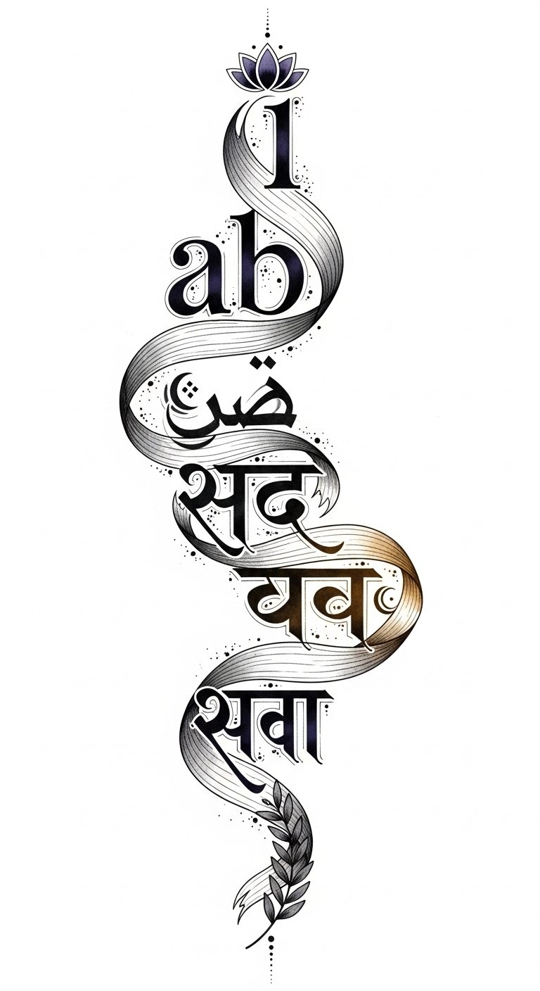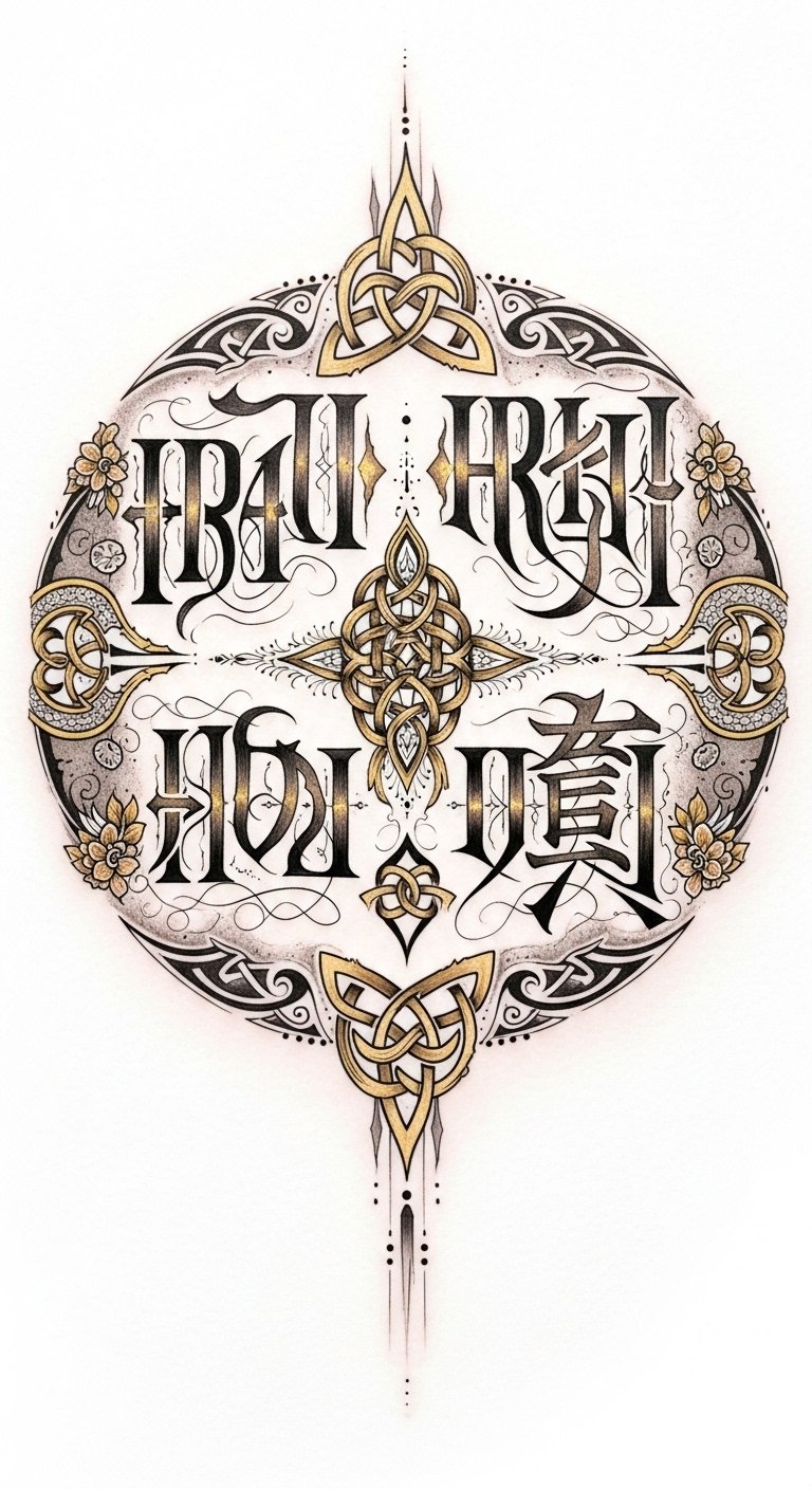 Place the design along the inner forearm to allow the woven scripts to follow natural contours and be read in motion, or center it on the upper back as a statement piece; the interlaced scripts symbolize harmony between traditions, the watercolor accents evoke emotional warmth and contemplation, and the cultural motifs tucked into negative space act as intimate markers of heritage and personal narrative.