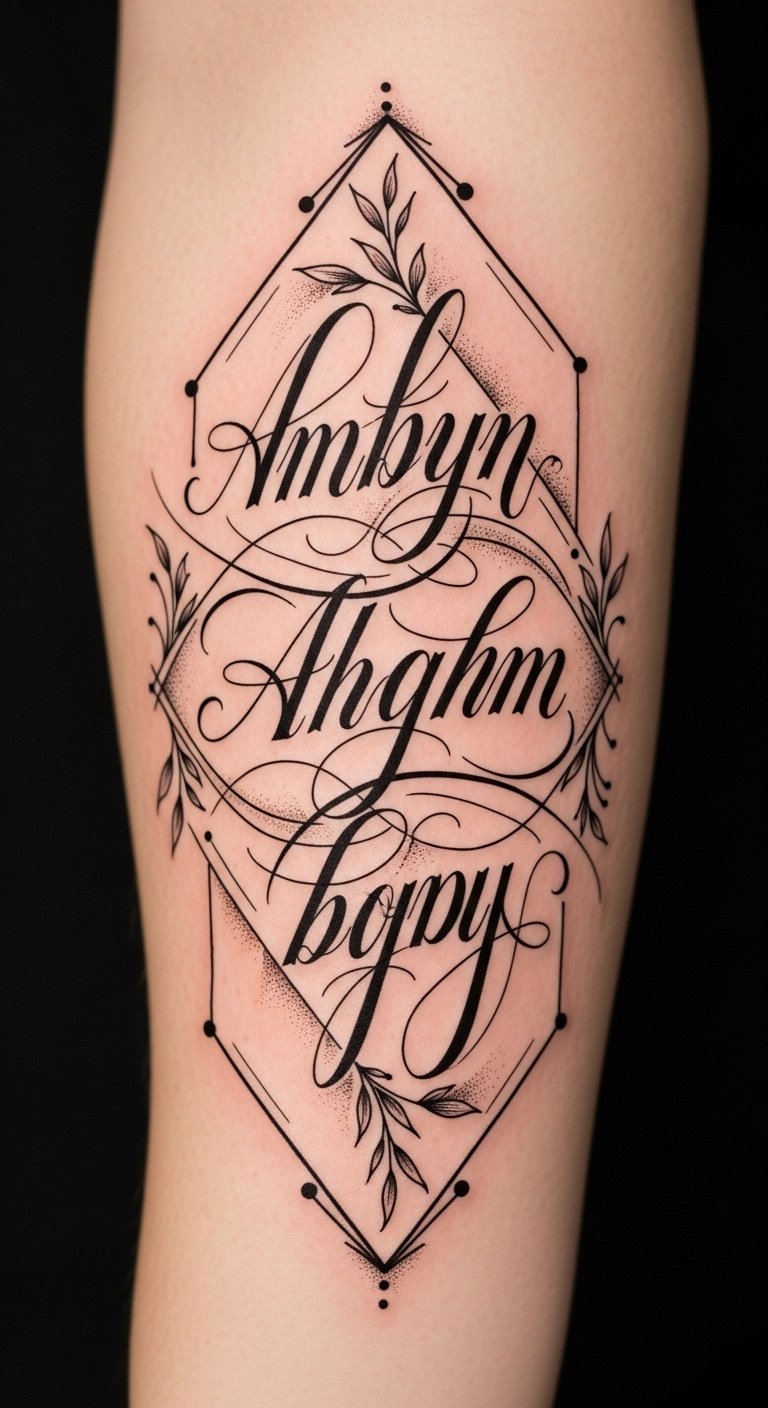 This freedom to create guarantees your tattoo stands as a proof of who you are, allowing your identity to shine through in every twist and turn of the design. The ambigram’s mirrored structure symbolizes resilience and duality, the vines evoke growth and continuity, and the geometric framing adds balance and intention; emotionally the piece communicates self-authorship and quiet confidence.