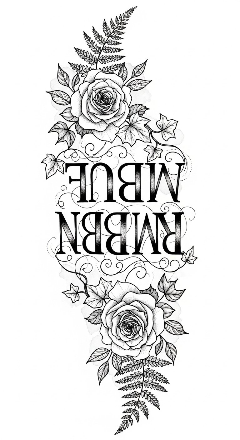 The organic shapes of leaves and petals weave seamlessly into designs, embodying botanical symbolism, and creating a unique expression of freedom that celebrates your connection to the natural world. This design balances readability with ornamentation: the roses symbolize love and growth, ivy suggests resilience and connection, and ferns convey new beginnings; together they evoke calm strength and personal transformation.
