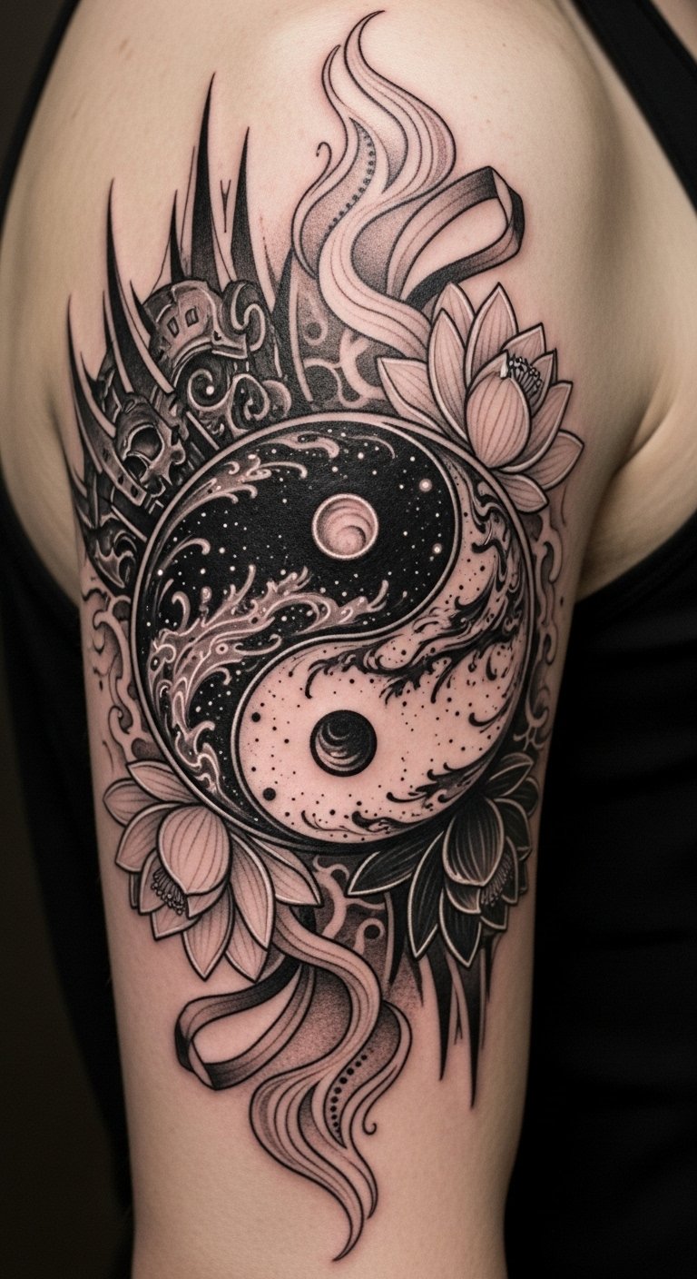 A forearm or upper back tattoo combining mirrored imagery—a flowing black ink yin yang wave morphing into a white-lit sun and moon, delicate geometric symmetry lines, and intricate opposing flora (thorned rose vs. soft lotus) —designed in fine line and dotwork to convey balance, contrast, and unity. Symbolically it represents the coexistence of strength and vulnerability, light and shadow; emotionally it offers calm affirmation and personal harmony. Placement on the inner forearm allows daily visibility and personal reflection, while the upper back suits larger, contemplative compositions for private resilience.