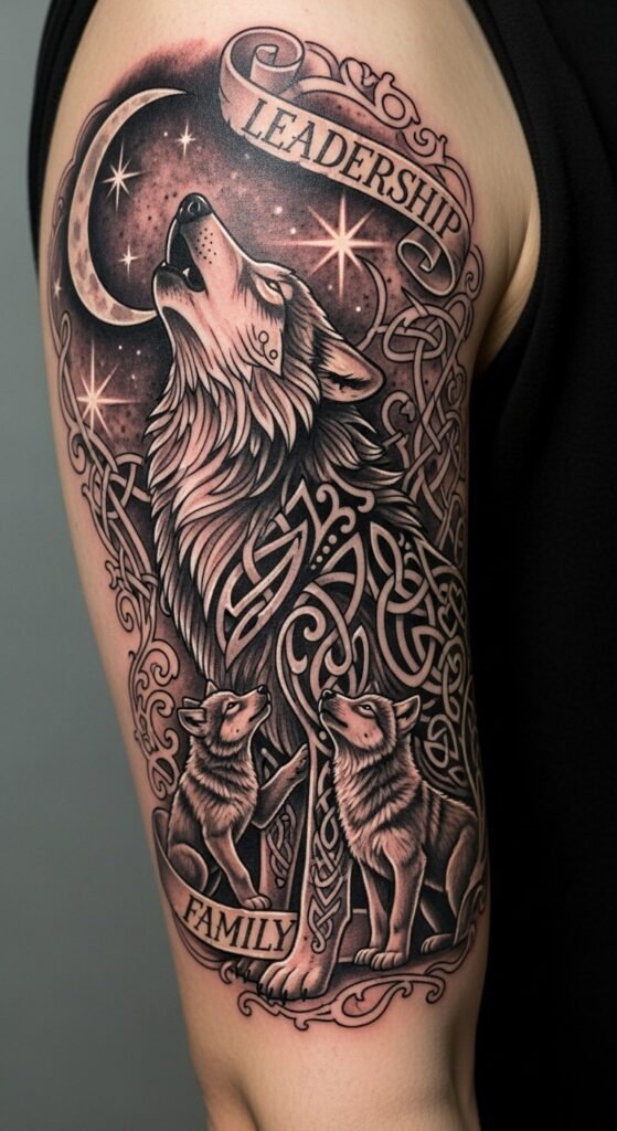 With its loyal companionship, the wolf guides its pack, showcasing unmatched leadership qualities. This stunning tattoo reflects your commitment to family and strength, igniting your spirit.