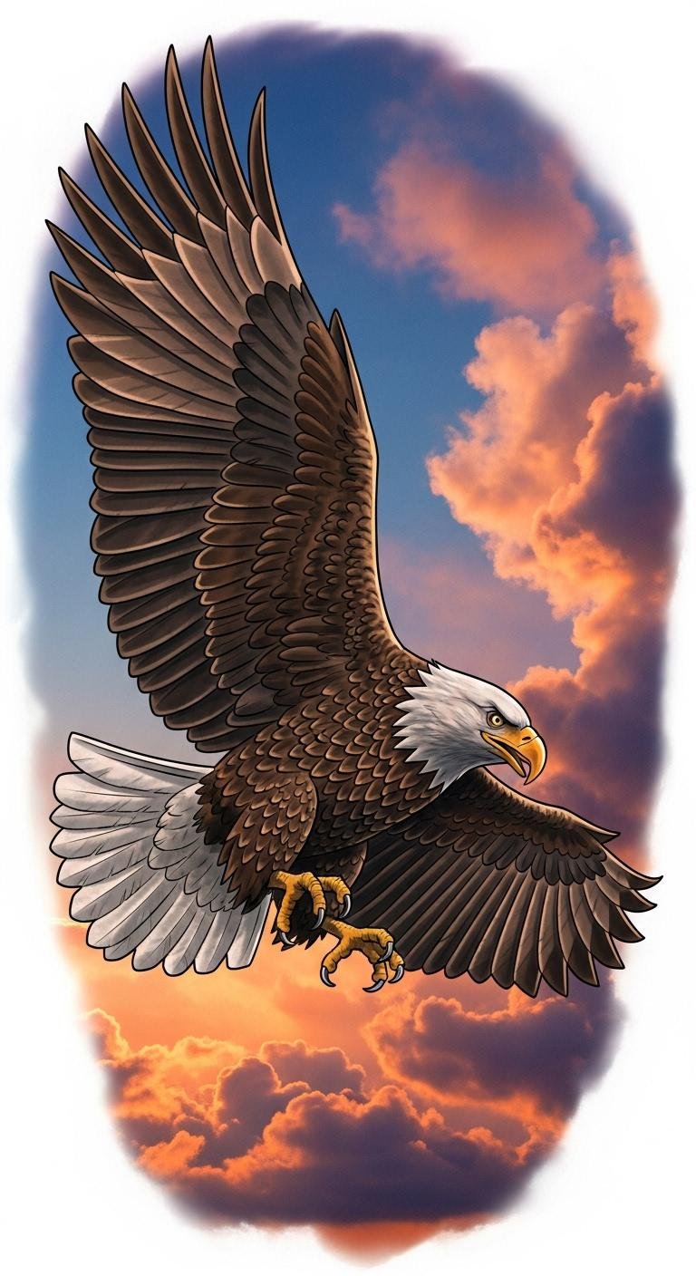 Soaring high against a backdrop of blended crimson and azure, the eagle sits centered with outstretched wings, bold black linework and traditional Americana shading; include stars and a subtle banner for name or date beneath, feathers detailed with dotwork highlights and a fierce gaze angled slightly downward.