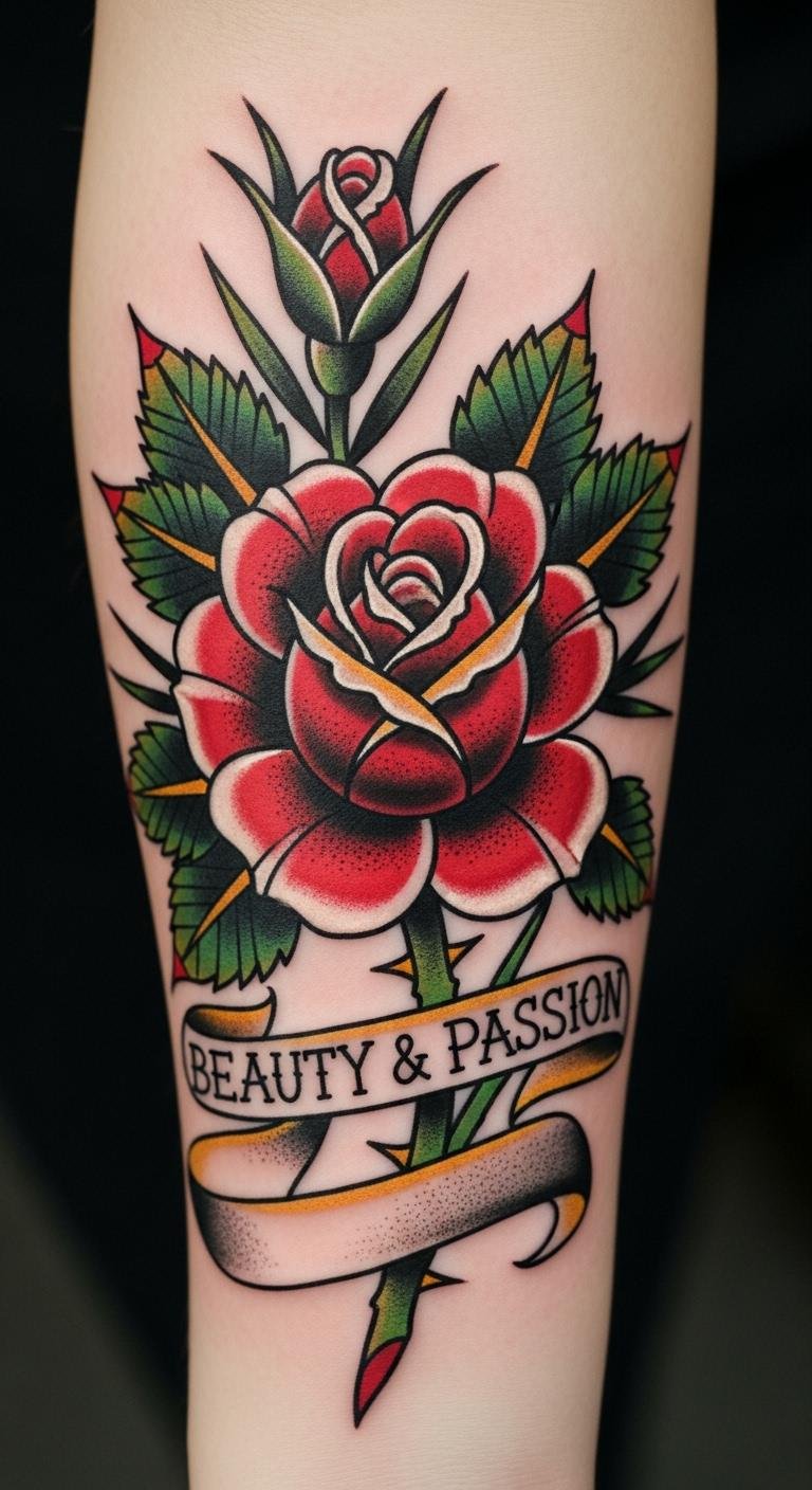 This design leans into classic American traditional emotion—prideful, warm, and resolute—suitable for visible placements like the outer forearm or upper chest where the banner can curve naturally; the bold lines ensure longevity and clarity as it ages.