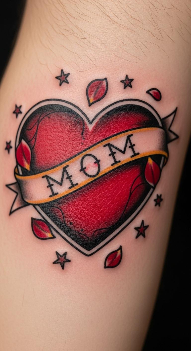 This design uses the heart as a focal emblem of love and remembrance, the banner allowing personalization for a name, short phrase, or date to anchor memory; the rose petals tie the piece to traditional romantic symbolism while stars and weathered shading add timelessness and emotional depth.