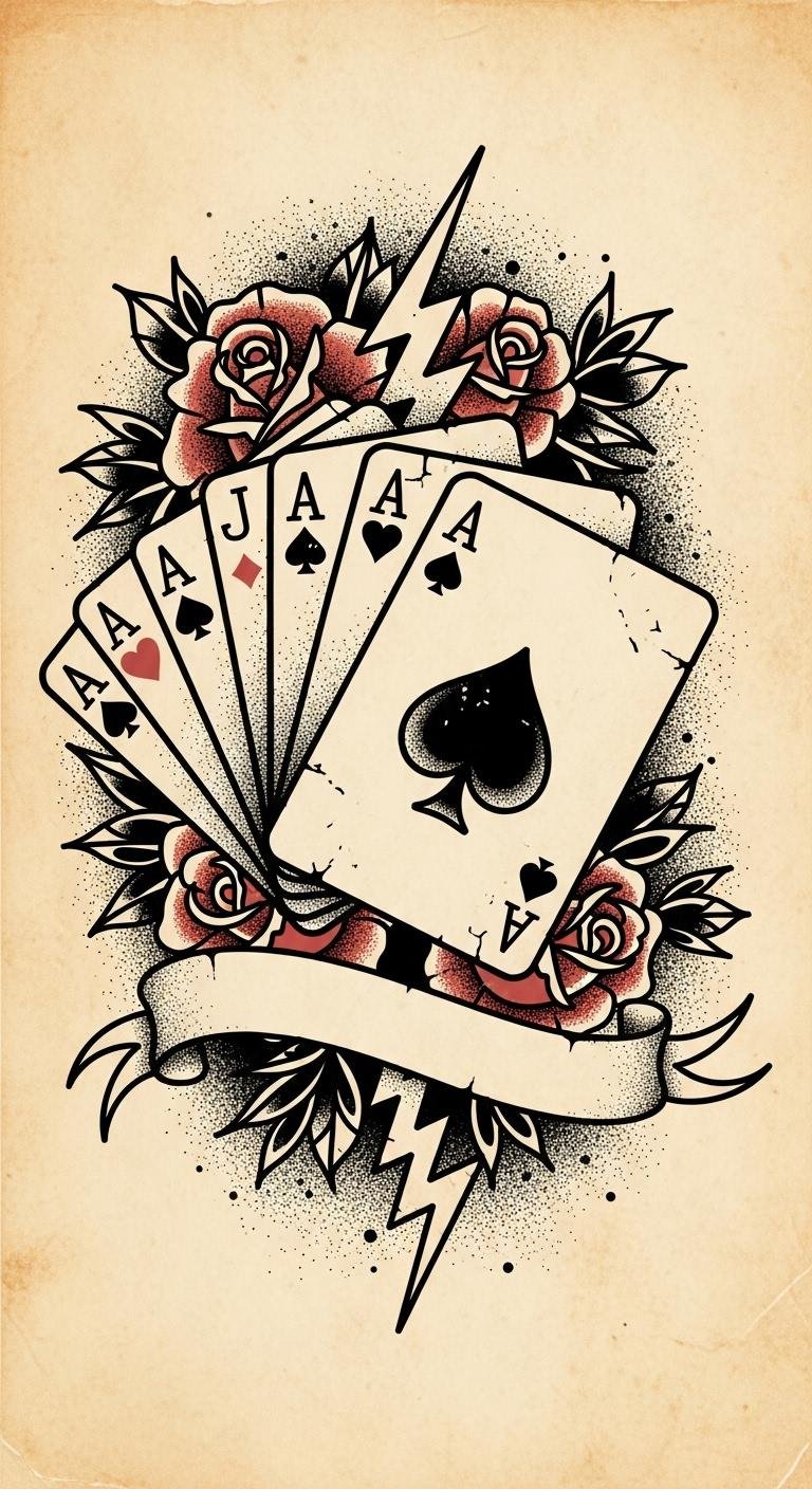 These tattoos remind you that every gamble is a chance to embrace freedom, adventure, and the beautiful chaos that life offers. The design marries classic luck iconography (ace, spade, rose) to convey risk and romanticism; bold lines and muted reds evoke nostalgia and grit, while stippling adds depth and impermanence—ideal on the outer forearm or upper chest where its forward-facing layout reads as a personal emblem of courage and appetite for adventure.