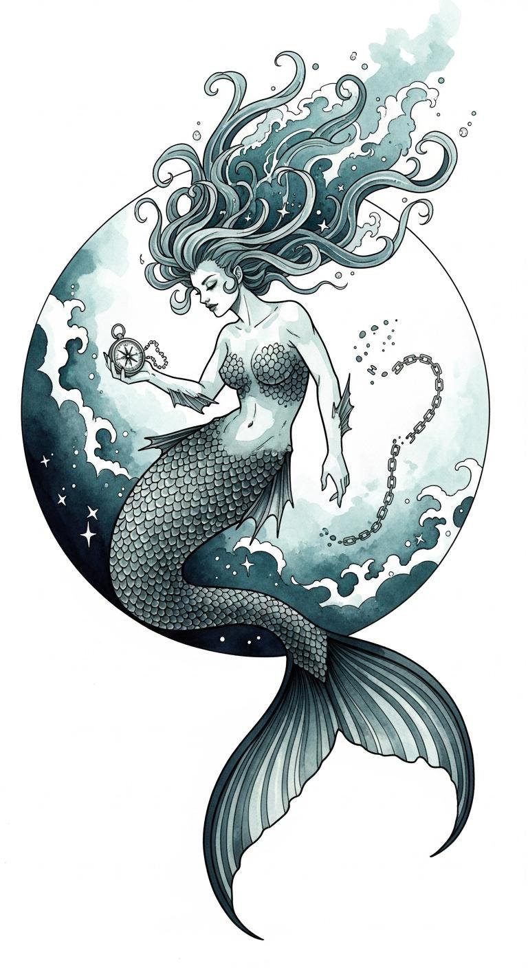 The watercolor washes convey fluidity and emotion, while fine-line details preserve elegance and readability at small sizes. Ideal placements are the shoulder blade, forearm, or calf where the circular composition can flow with the body’s contours and the piece can be expanded into a larger sleeve or back piece.
