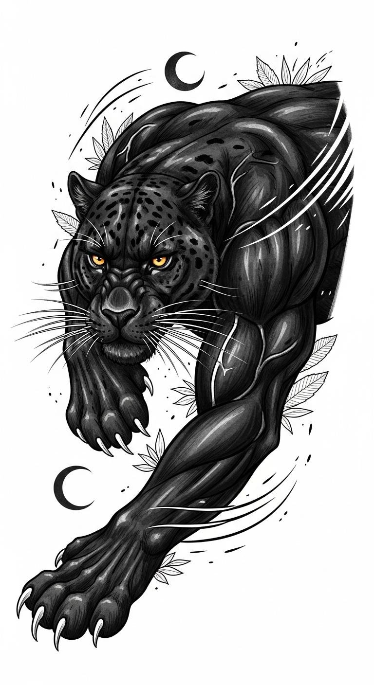 This design harnesses that energy to evoke stealth, protection, and inner ferocity; placement along the forearm follows the panther’s forward motion to suggest momentum and personal empowerment, while a chest placement centers the imagery over the heart to symbolize courage and steadfast resolve.