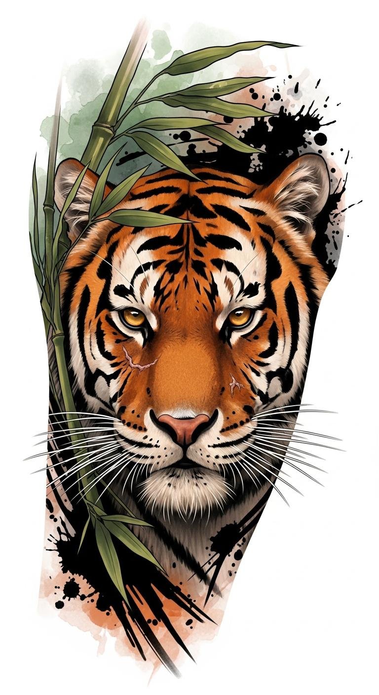 A bold half-sleeve design centered on the tiger’s head conveys courage and resilience through posture and expression—the forward-facing roar and focused eyes symbolize confronting challenges head-on; surrounding bamboo and ink splatters represent growth and past struggles turning into artful strength.