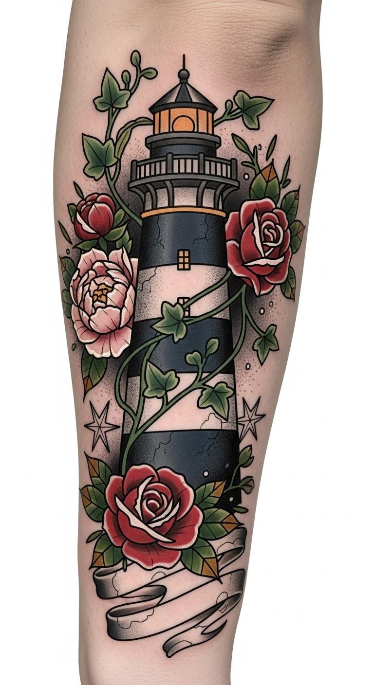 The lighthouse symbolizes guidance and resilience, the roses and peonies represent love and renewal, and the ivy signifies perseverance; together they evoke hope and protection.