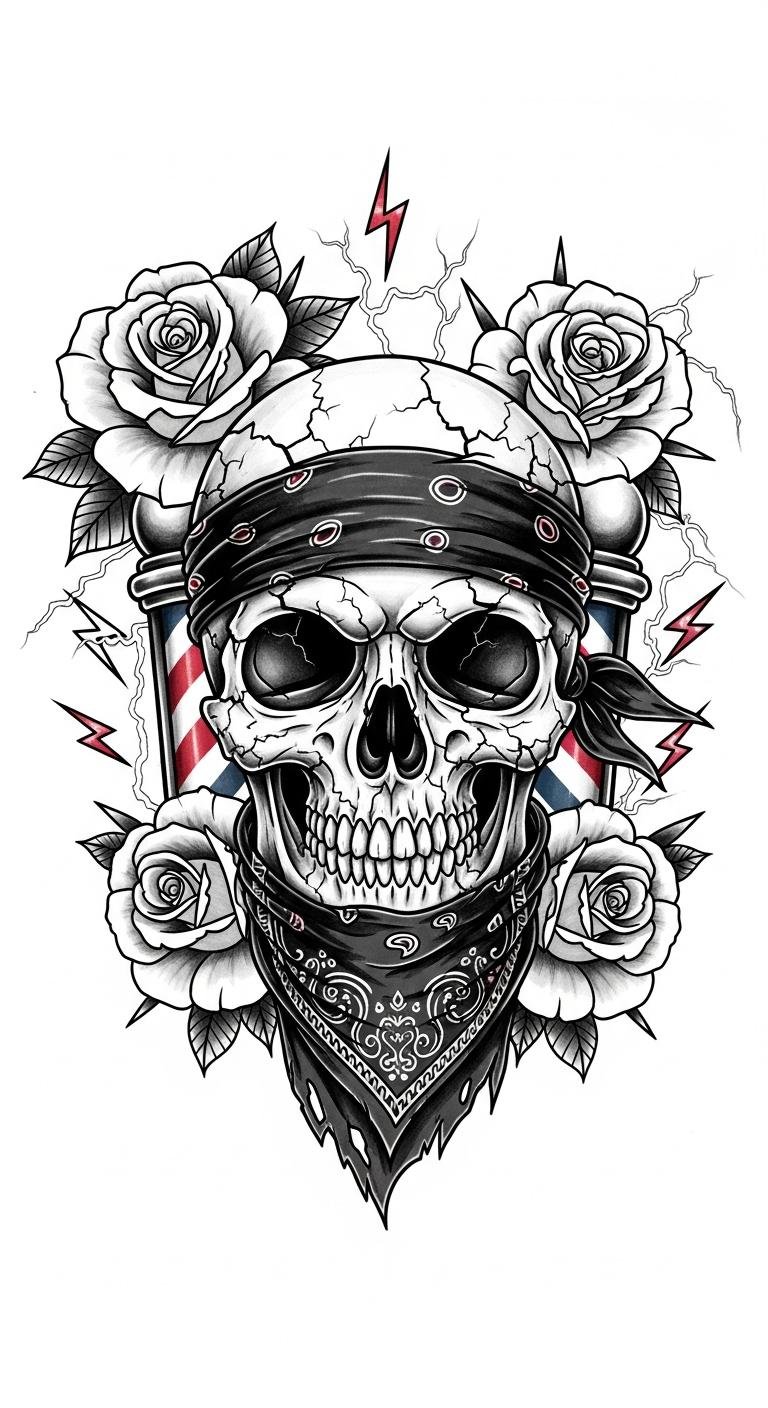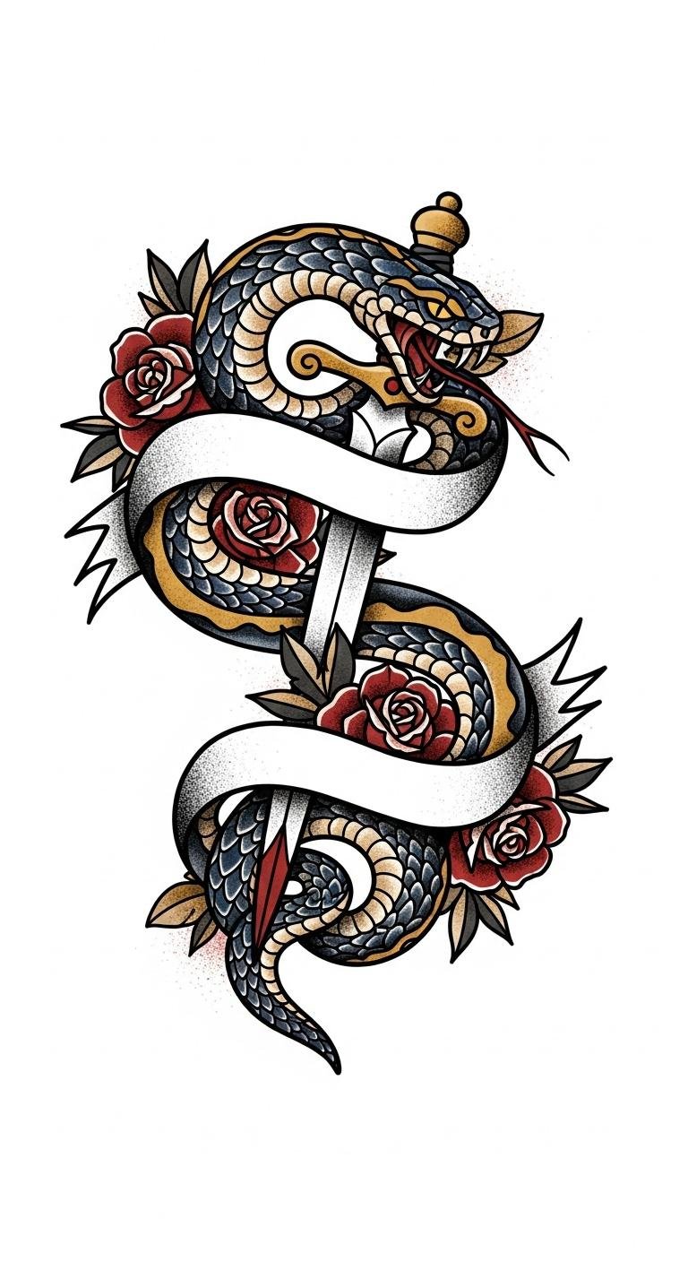 This design blends classic Americana boldness with intimate meaning: the dagger denotes trials overcome, the roses signal renewal and beauty amid hardship, and the serpent’s S-curve guides the eye along a narrative of change.