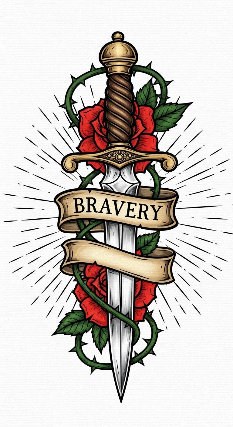 This design blends courage (the dagger) with sacrifice and beauty (the rose and thorns), evoking defiant hope and protective resolve. Emotionally it speaks to perseverance and readiness to face hardship while honoring what you defend.