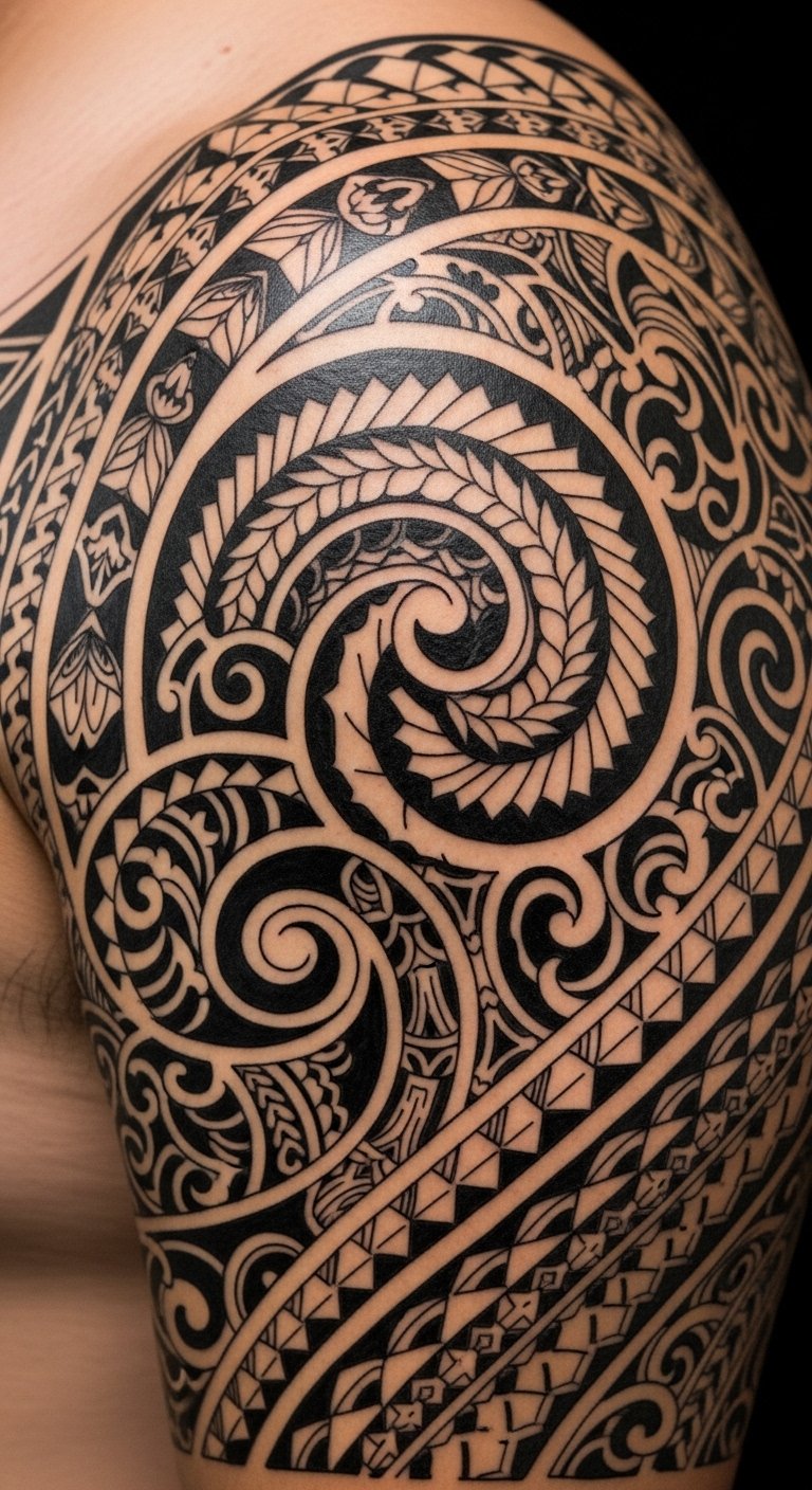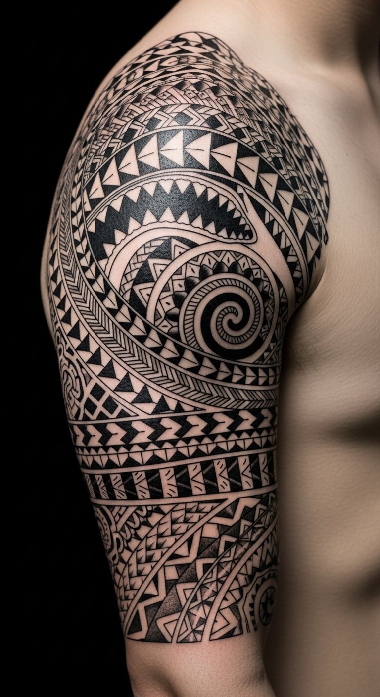 The design balances strength and continuity—shark teeth for protection, koru spirals for growth, and tapa textures for lineage—evoking pride and reverence; ideal placed as an upper-arm band that extends over the shoulder and onto the chest to follow natural musculature and convey visible, personal storytelling.