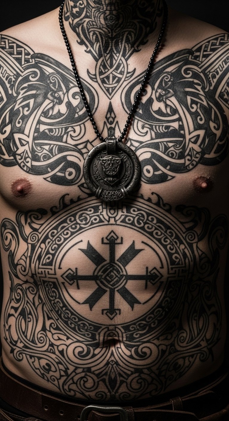 Emotionally it evokes solemn pride and deep connection to heritage, meant to inspire reverence rather than ostentation. Ideal placement is upper chest for visibility and closeness to the heart, or full back for a grand ancestral canvas that reads as both armor and remembrance.