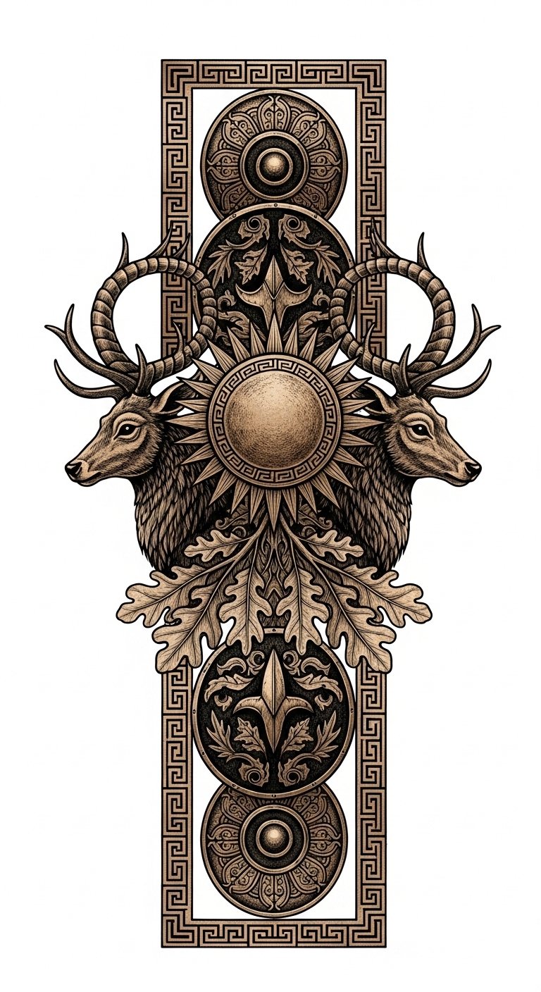 A compact design that blends solar power, stag guardianship, and warrior heritage to evoke pride and resilience; the sun disc symbolizes divine favor and life-force, the horned stags represent protection and connection to nature, meander patterns tie to continuity and tribal lineage, and oak leaves signify strength — together creating a composition that reads both bold and ceremonial.