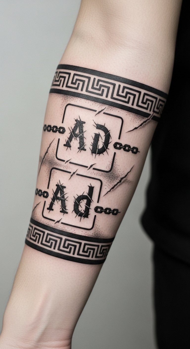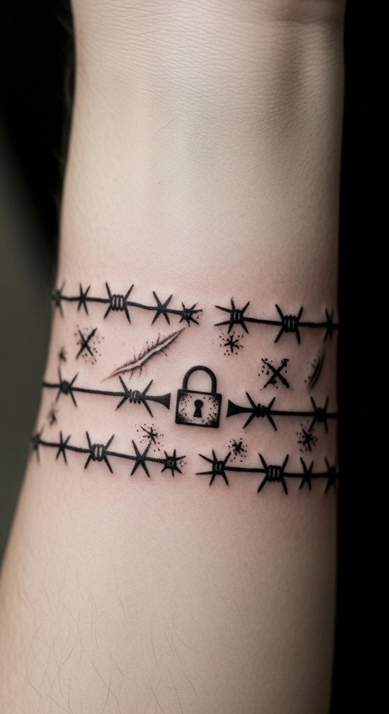 A forearm placement that reads like both history and a personal reclaiming: the barbed band references chains and branding, the distressed glyphs echo ancient marks of ownership, and the broken lock in negative space symbolizes resistance and regained autonomy. The worn, scar-like strokes evoke pain and endurance, while the realistic shading keeps the piece intimate—meant to sit where it can be seen and touched, transforming a record of subjugation into a deliberate statement of survival and identity.