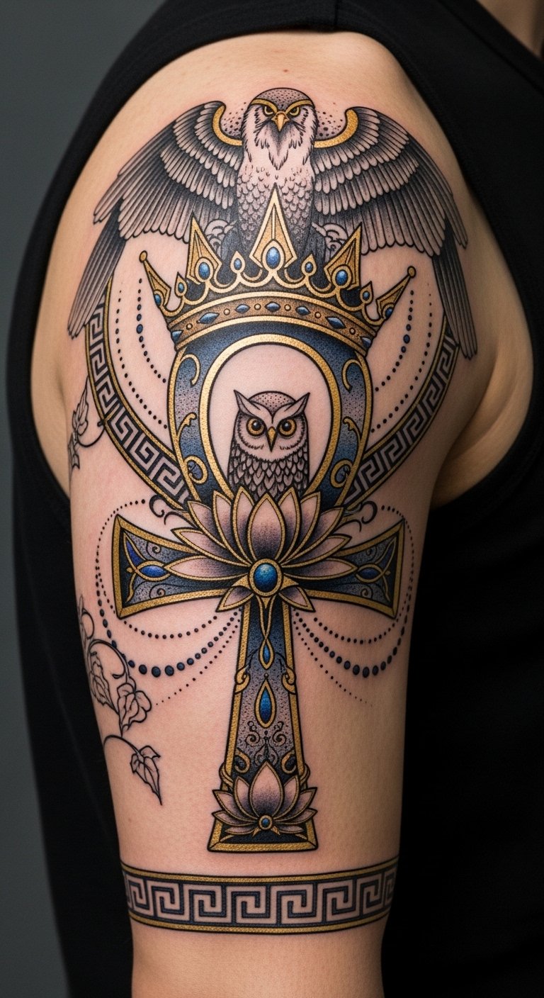 The design melds those elements: the ankh for life and continuity, the Eye of Horus for protection and restoration, the lotus for rebirth, and falcon wings for divine guidance.