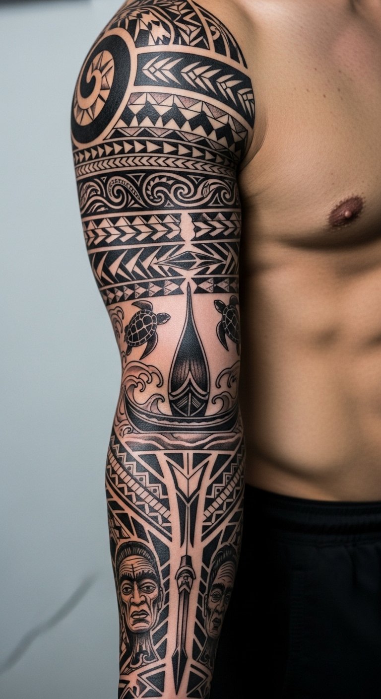 Ideal placement is a full arm sleeve wrapping shoulder to wrist so the bands flow with muscle contours; negative space canoe at the inner forearm acts as a focal point visible in moments of reach or embrace, while higher shoulder elements crown the design and anchor it to lineage.