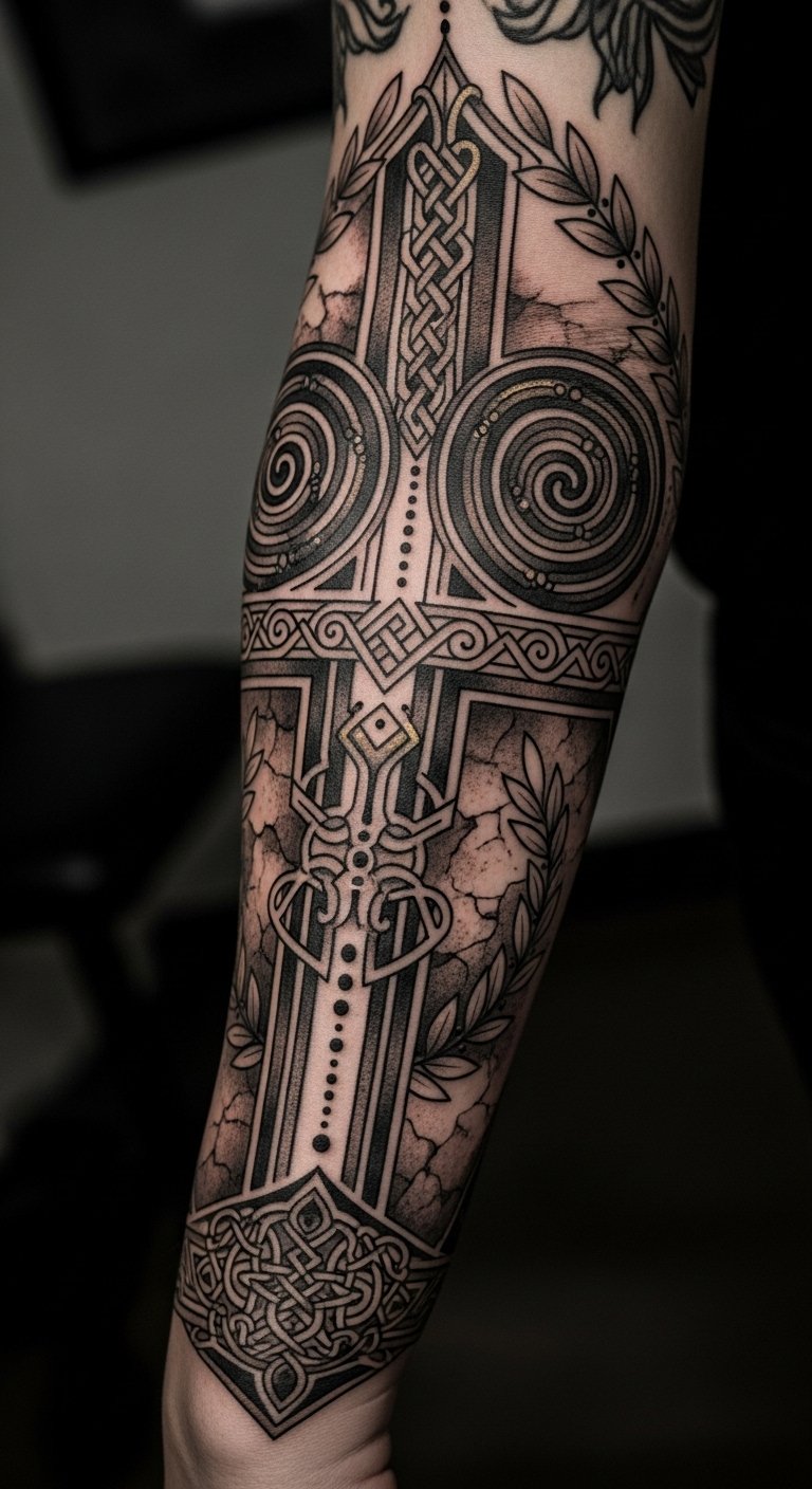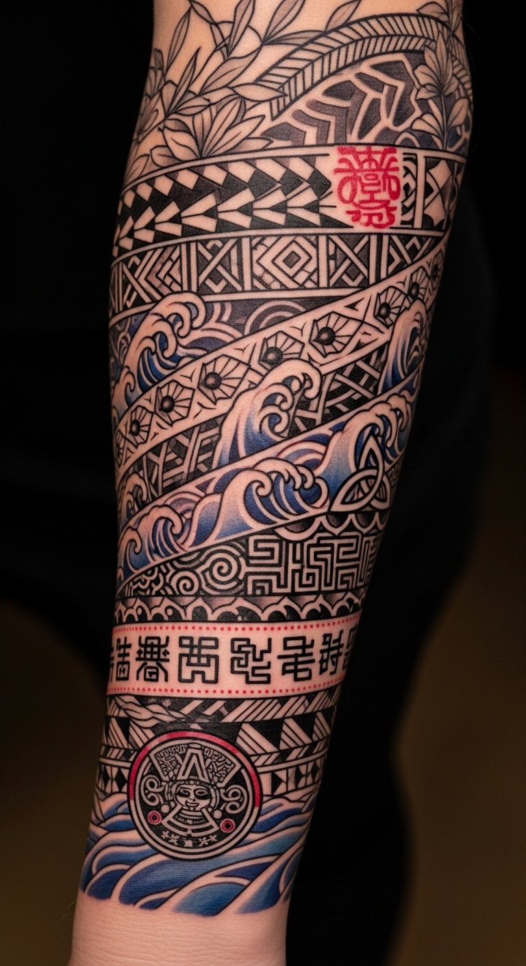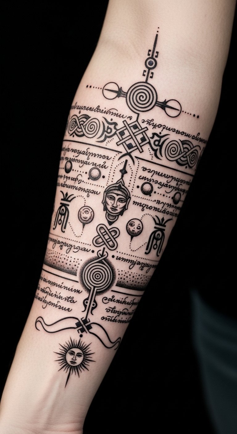 The design conveys layered meaning: the geometric anchors speak of lineage and protection, waves and botanical elements evoke movement and renewal, Celtic knots symbolize continuity, and glyphs reference ancestral memory; it aims to feel ancestral and personal, placed along the forearm so it wraps and reveals itself with gesture, allowing both private contemplation and public display.