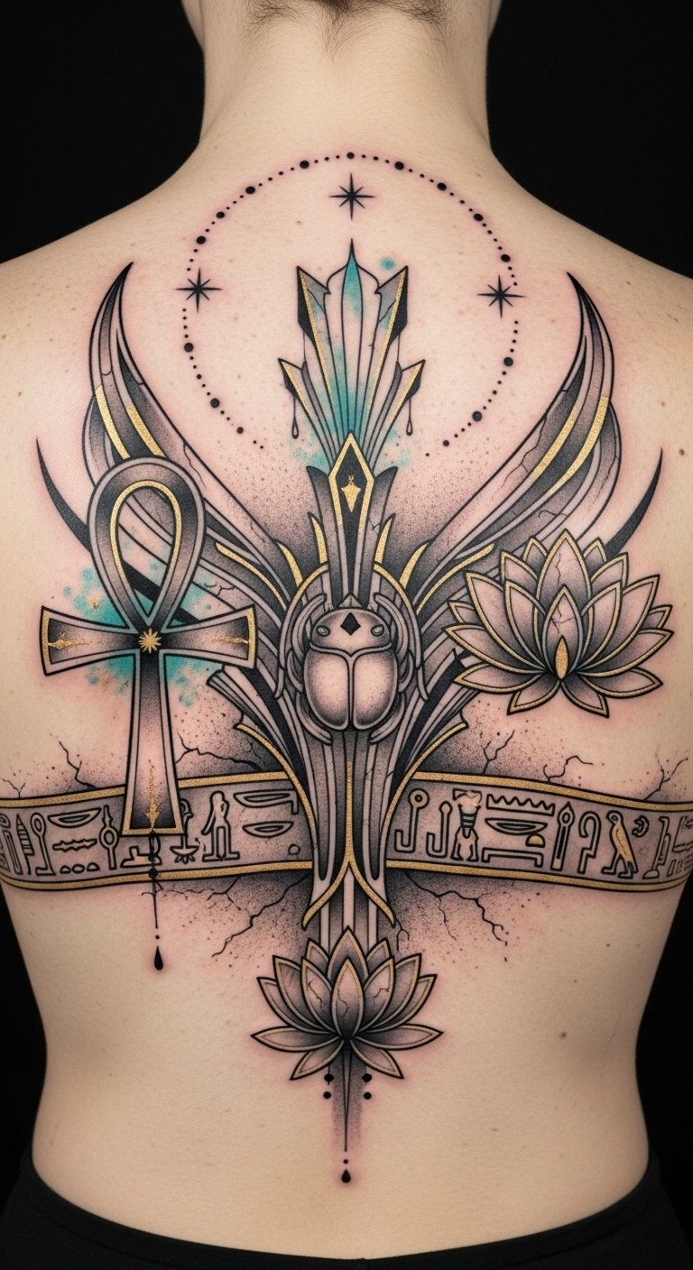 These sacred symbols not only adorned the body but also served as spiritual armor, connecting the wearer to the divine and the cosmos, ensuring a powerful legacy that resonates through time. The design evokes protection (ankh, scarab), rebirth and purity (lotus), and rooted life (papyrus), while the star halo and hieroglyphic band add cosmic connection and personal narrative; emotionally it balances reverence and empowerment, fitting as a visible forearm talisman or a larger contemplative upper-back statement.