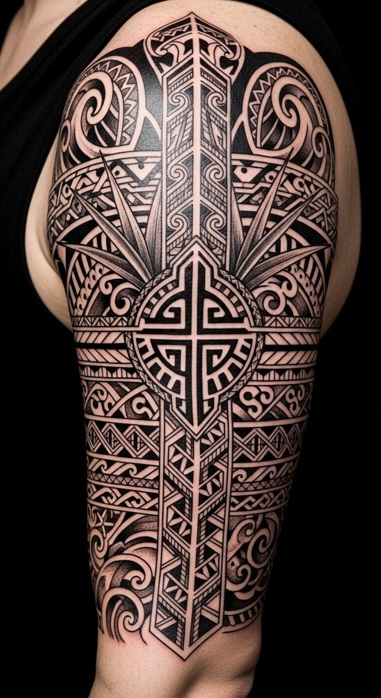 This design concept merges carved spearheads, interlocking manta ray motifs, and a central koru spiral to symbolize strength, guidance, and new beginnings; fine tapa-pattern filler lines echo ancestral stories and the ocean’s rhythm. Emotionally it conveys pride, continuity, and quiet resilience—rooted tradition meeting personal evolution—meant for a bold forearm sleeve wrapping from wrist to elbow or as a chest panel radiating toward the shoulder, following muscle contours so the motifs flow with body movement and invite touch and reflection.