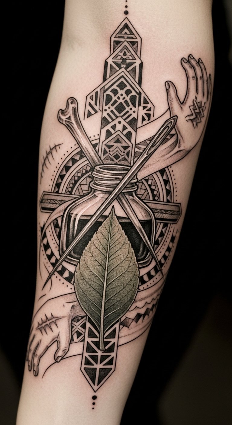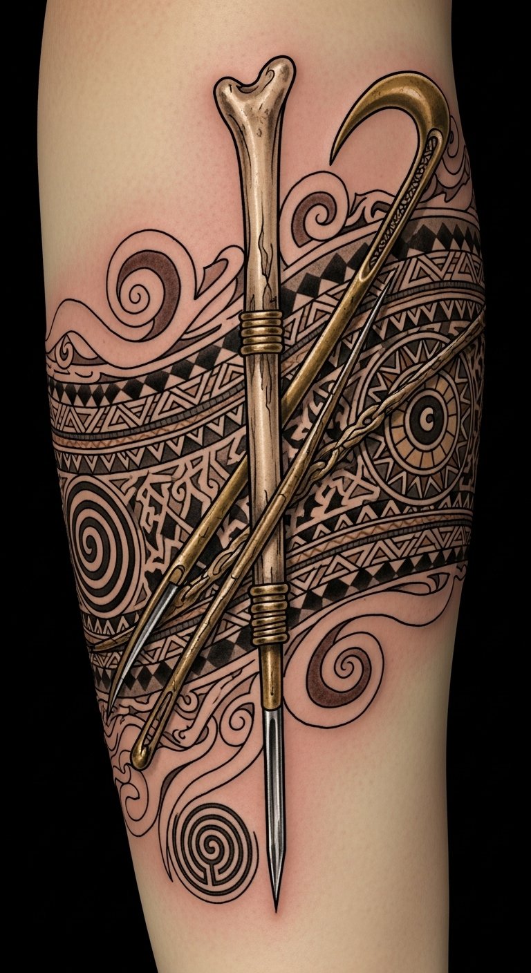 This design symbolizes continuity between past and present: the bone needle and plant ink evoke ancestral craft and resilience, the Polynesian motifs honor communal knowledge and rite, and the gentle scars and dots speak to personal transformation; placed on the forearm or ribcage the piece can be shown as a visible testament to identity or kept intimate, eliciting reflection, pride, and a quiet, rooted joy.